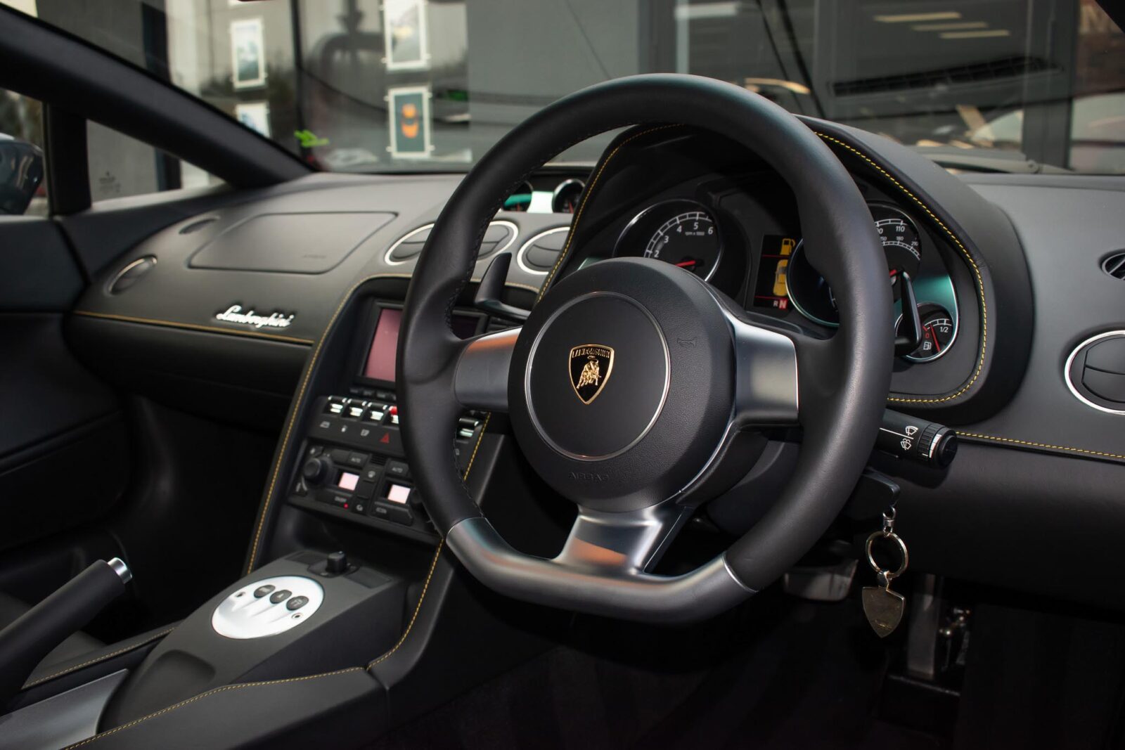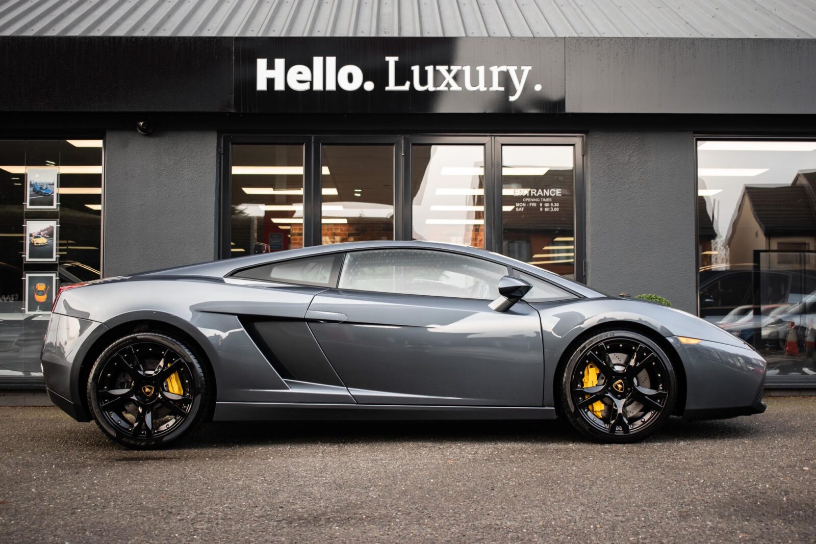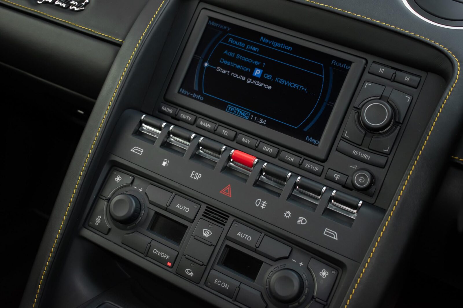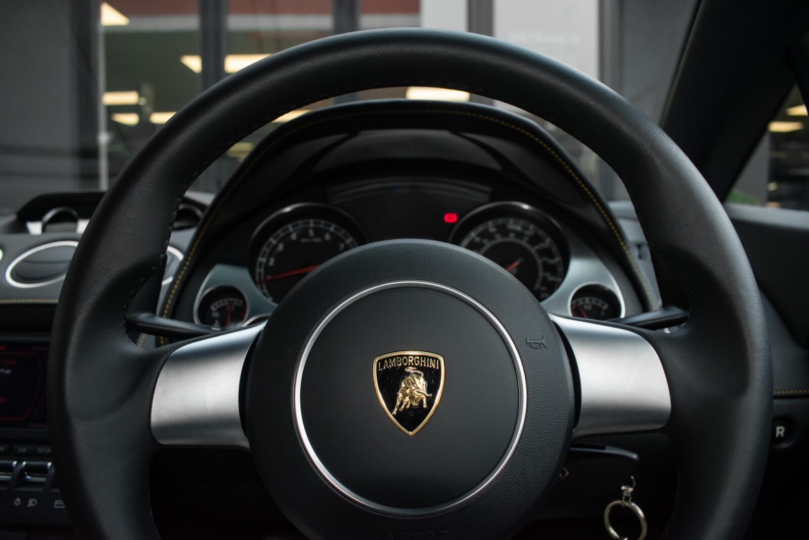 Proteus Grigio metallic. Black leather interior with Yellow contrast stitching, climate control, leather headlining, satellite navigation, upgrade Callisto split rim alloys in Gloss Black, glass engine cover, Giallo brake calipers, power fold mirrors, sports exhaust. Tracker. 3 owners from new. Lamborghini car cover. Last owner for 14 years. Lamborghini main dealer service history. Just had major service. We believe this is the finest example on the market today, hands down the best example we have seen in the last decade. 12 months warranty and roadside assistance.