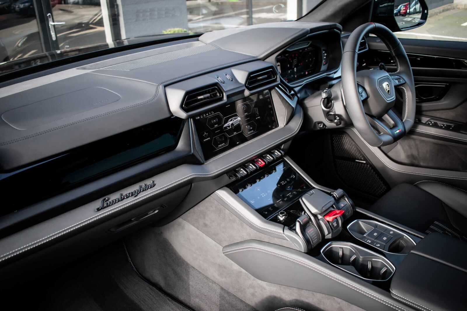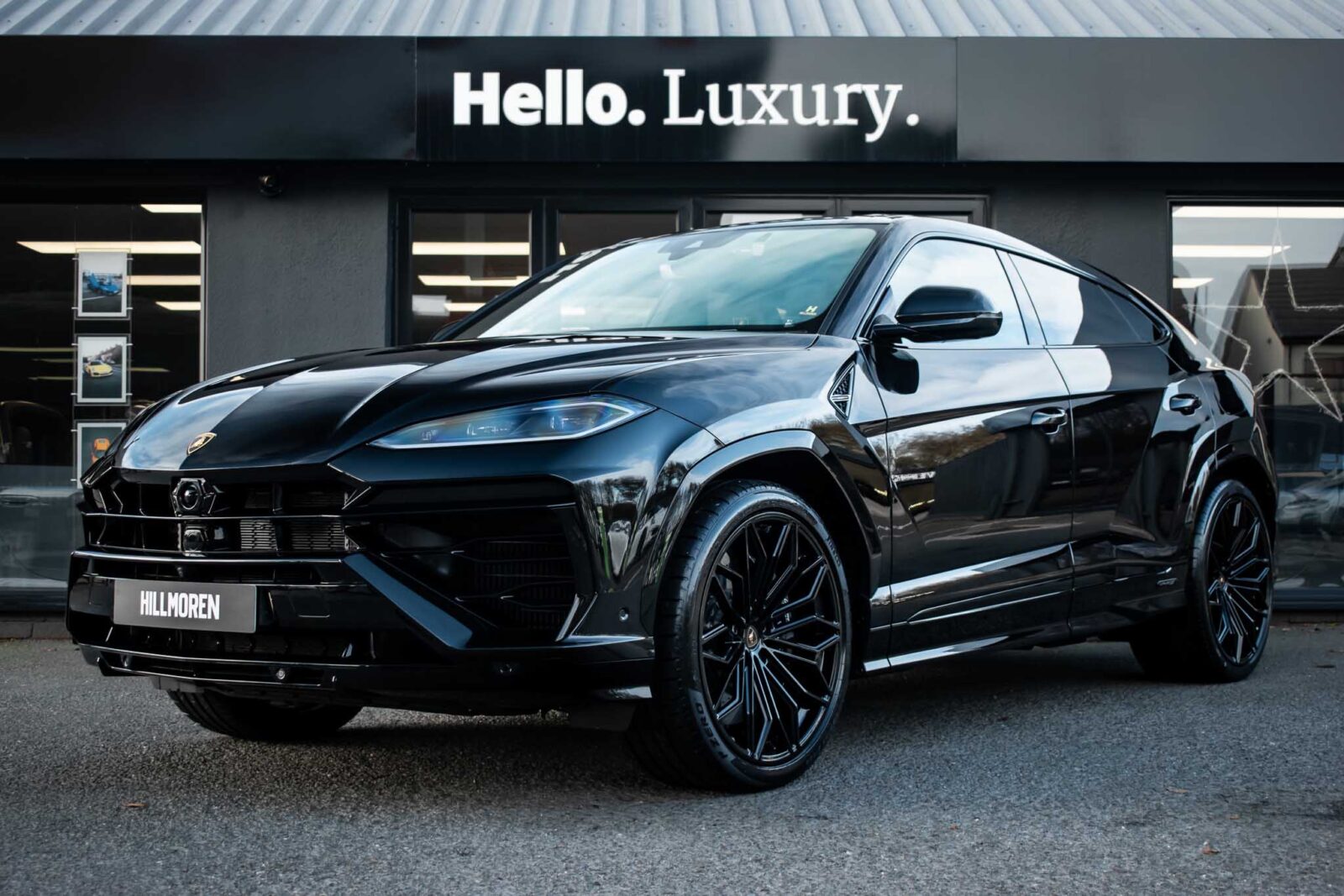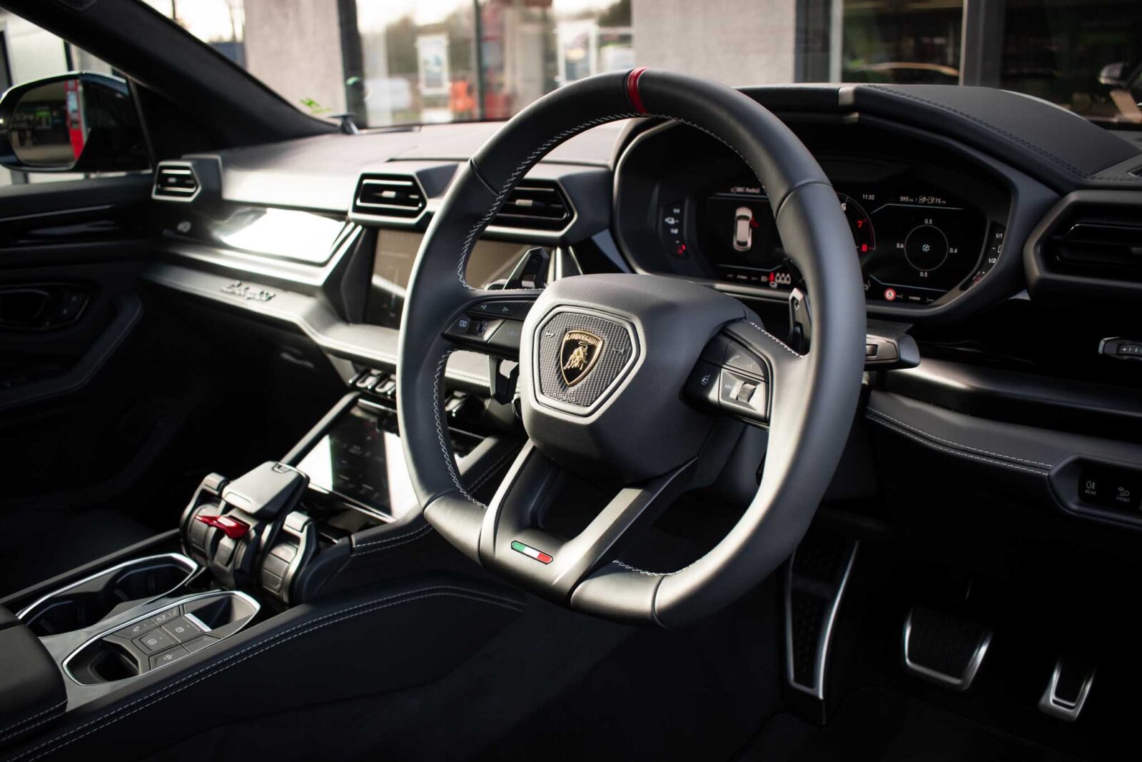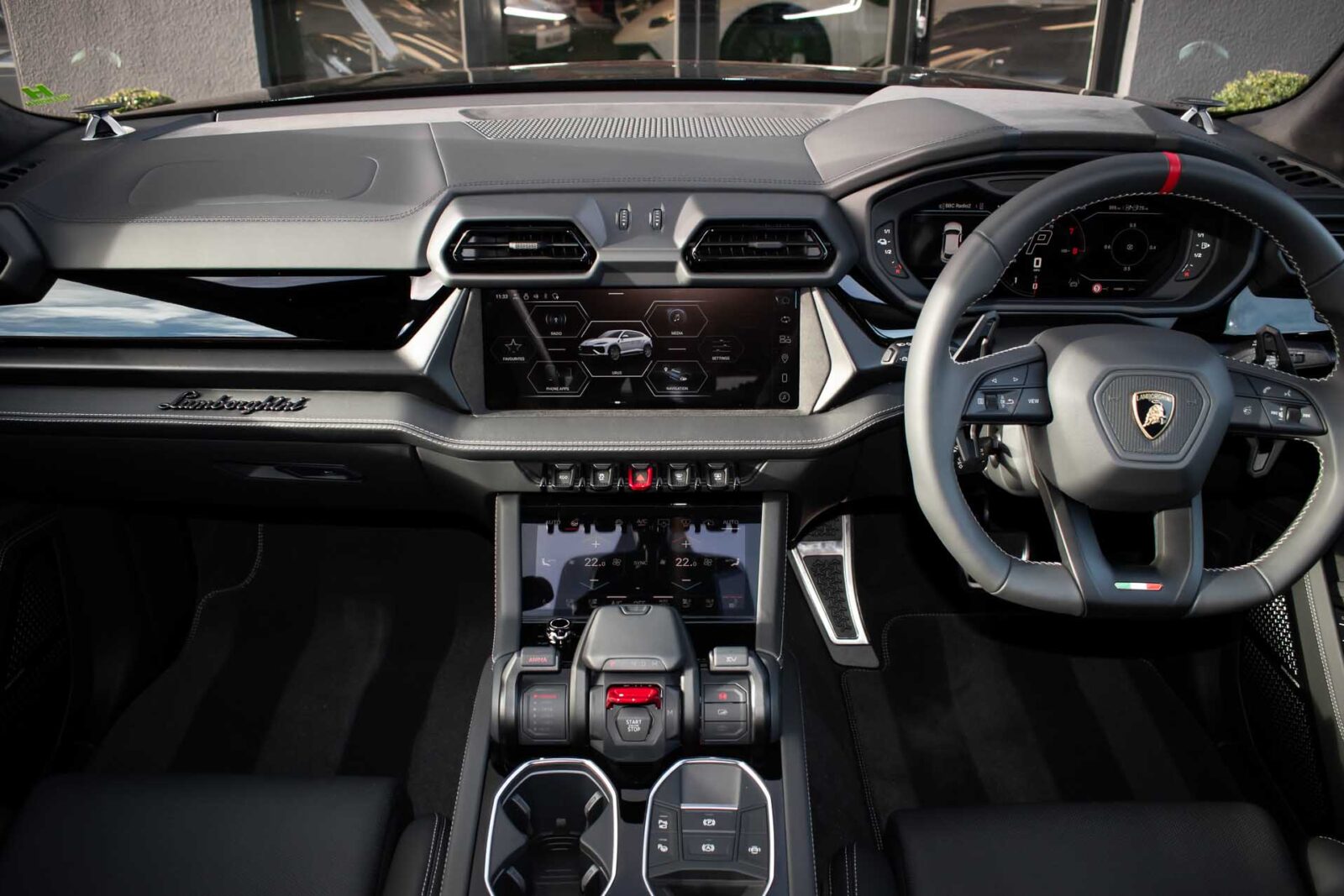 Nero Helene Black. Nero Ade leather interior with Performante trim with Grigio Cronus contrast stitching, full electric front seats with ventilation and massage function, Bang & Olufsen Advanced 3D sound system, heated leather multi-function Sport steering wheel, 23 inch Galanthus alloy wheels finished in Gloss Black, opening panoramic glass sunroof, heated seats front and rear, heated and heat reflective windscreen, Homelink garage / gate opener, leather piped floor mats, Style package in Gloss Black, exhaust tailpipes finished in Matt Black, embroidered Lamborghini shields on headrest, configurable ambient lighting, interior Dark package, Lamborghini AMINA off road modes, Black Anodized treatment on Aluminium inserts, rear privacy glass, Parking Assistance package with remote Park Assist. Tracker. Balance of Lamborghini factory 4 year warranty and 5 year service plan. Full Topaz paint protection film application interior and exterior. Available for immediate delivery!