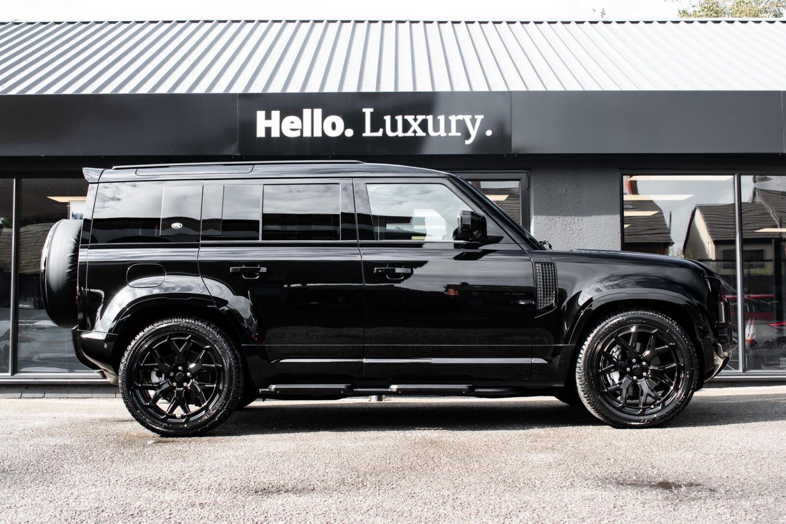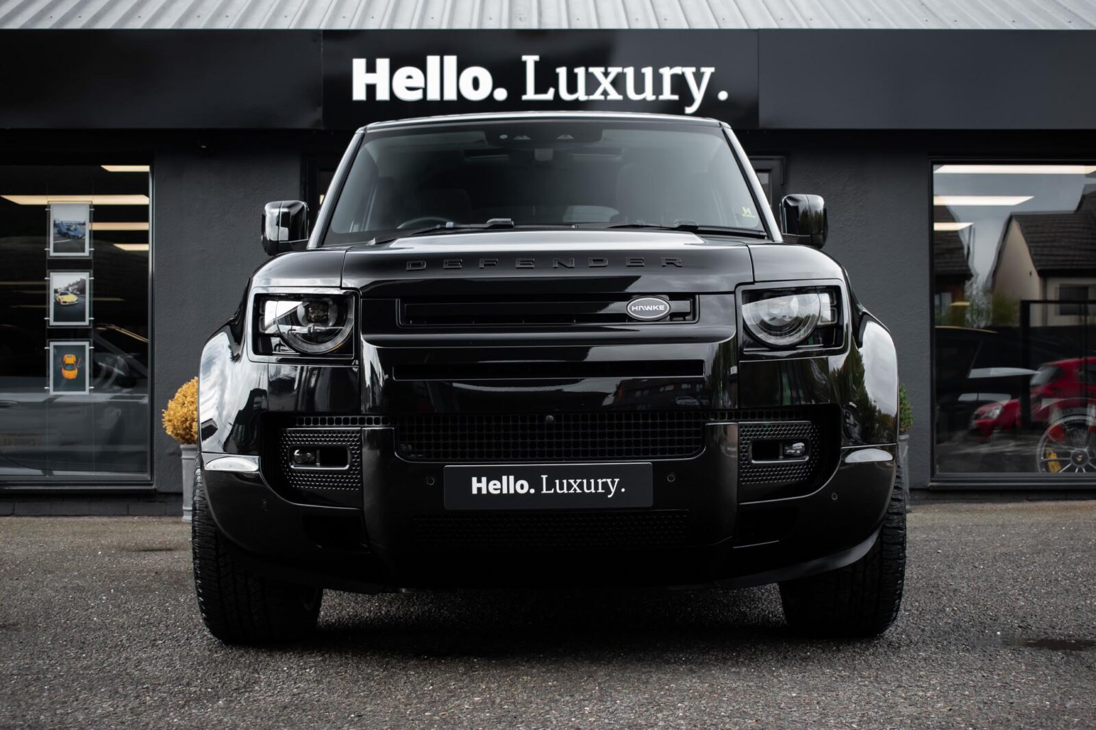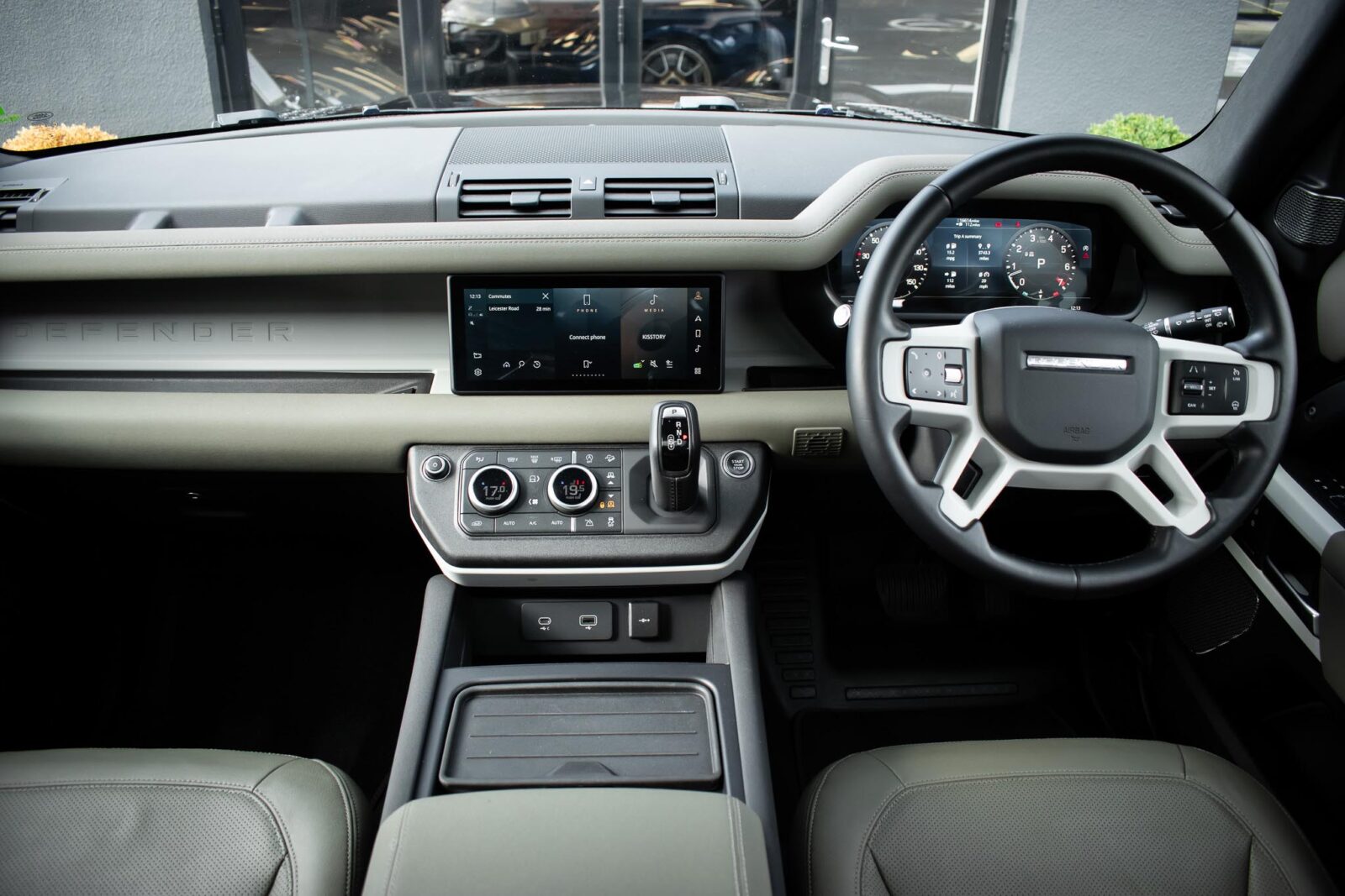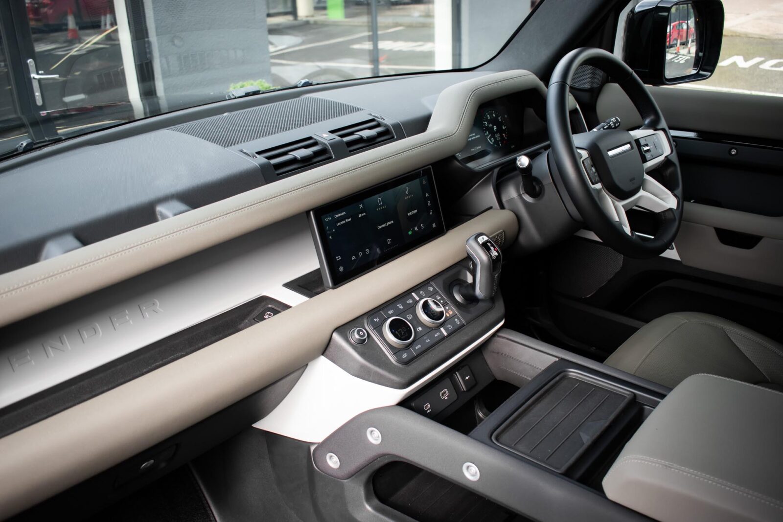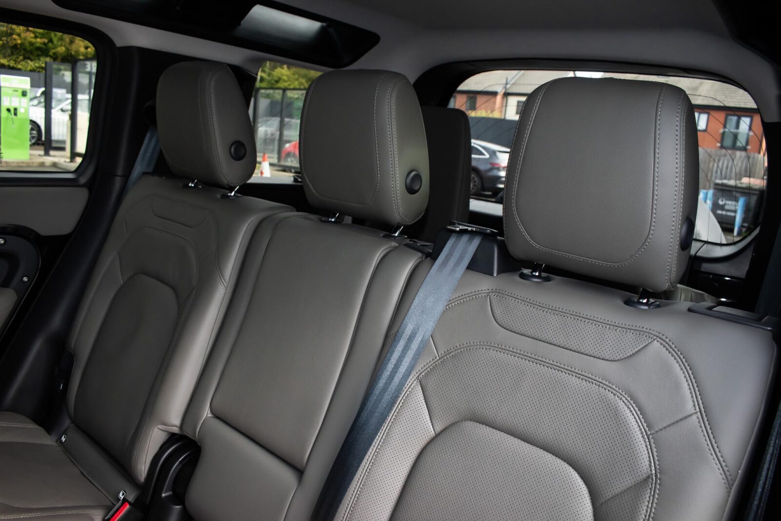 Santorini Black metallic. 7 seat configuration. Khaki perforated Taurus leather front electric seats with lumbar support, heated/cooled front seats, 3 zone climate control, cabin air ionisation / PM2.5, cruise control, 10″ infotainment touch screen, interior smart view mirror, satellite navigation, media interface, Bluetooth, DAB radio, Apple CarPlay, Android Auto, Meridian surround sound, voice activated controls, multi-function heated leather steering wheel, front armrest with coolbox, Light Oyster Morzine headlining, sliding panoramic roof, Black roof rails, Black pack, 22″ Hawke Havoc gloss black alloy wheels with new Yokohama tyres, Hawke fixed side steps in black, Hawke rear spoiler, Black spare wheel cover, Signature Matrix LED headlights with DRL, illuminated tread plates, privacy glass, heated windscreen, keyless entry and ignition, electric steering column adjustment, blind spot assist, lane keep assist and upcoming traffic, reverse traffic detection, clear exit detection, adaptive speed limiter, 360 camera with front and rear parking sensors, continuous variable damping, water wading aid. Balance of Land Rover extended warranty till 08/04/2026.
