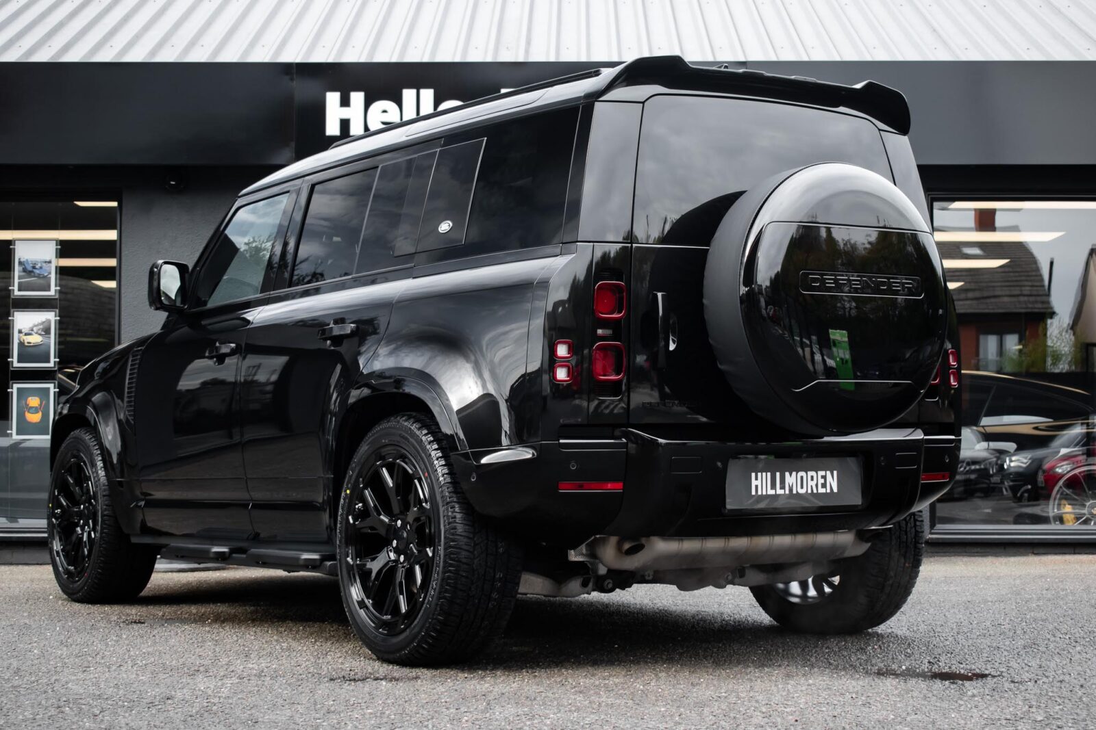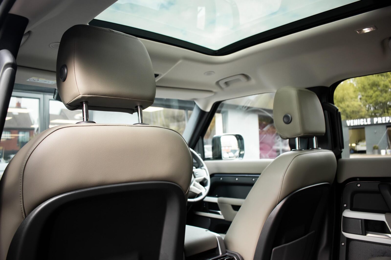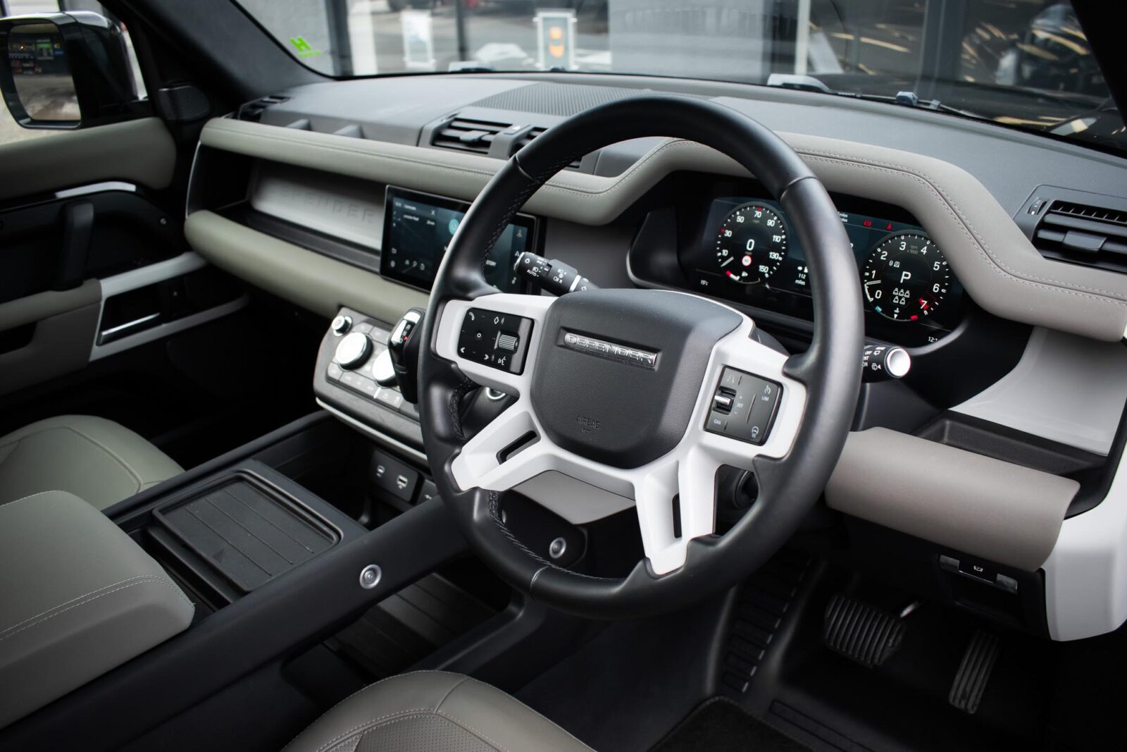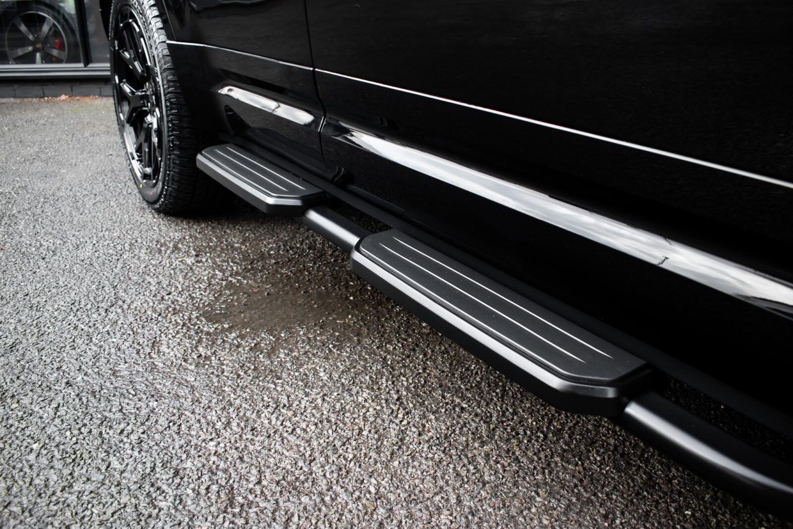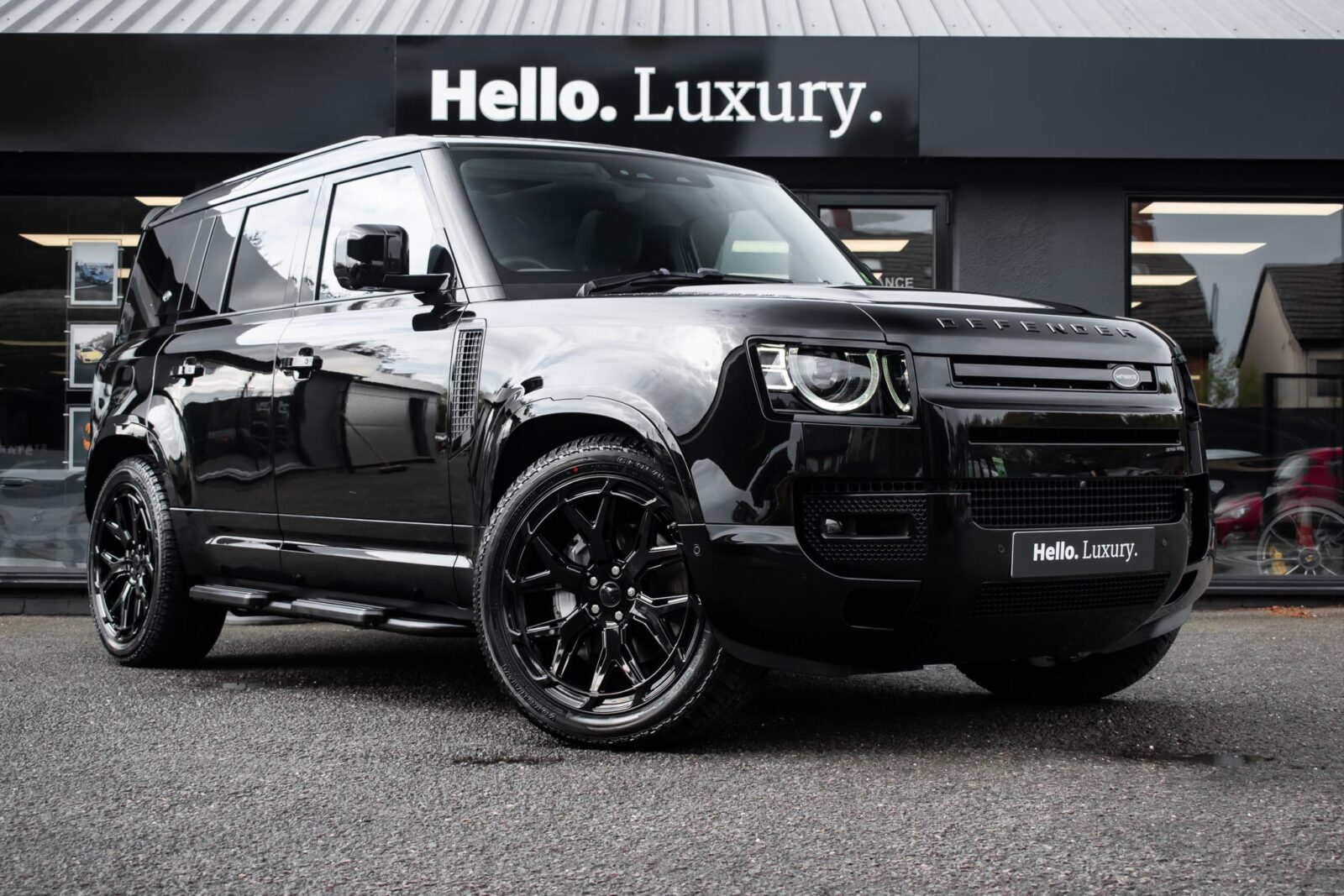 Santorini Black metallic. 7 seat configuration. Khaki perforated Taurus leather front electric seats with lumbar support, heated/cooled front seats, 3 zone climate control, cabin air ionisation / PM2.5, cruise control, 10″ infotainment touch screen, interior smart view mirror, satellite navigation, media interface, Bluetooth, DAB radio, Apple CarPlay, Android Auto, Meridian surround sound, voice activated controls, multi-function heated leather steering wheel, front armrest with coolbox, Light Oyster Morzine headlining, sliding panoramic roof, Black roof rails, Black pack, 22″ Hawke Havoc gloss black alloy wheels with new Yokohama tyres, Hawke fixed side steps in black, Hawke rear spoiler, Black spare wheel cover, Signature Matrix LED headlights with DRL, illuminated tread plates, privacy glass, heated windscreen, keyless entry and ignition, electric steering column adjustment, blind spot assist, lane keep assist and upcoming traffic, reverse traffic detection, clear exit detection, adaptive speed limiter, 360 camera with front and rear parking sensors, continuous variable damping, water wading aid. Balance of Land Rover extended warranty till 08/04/2026.