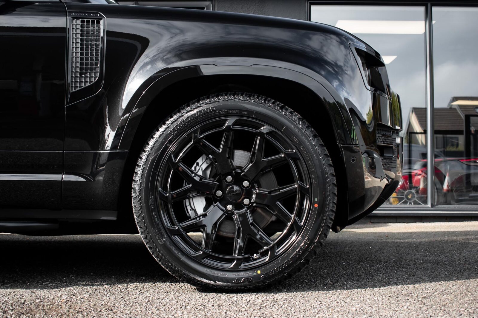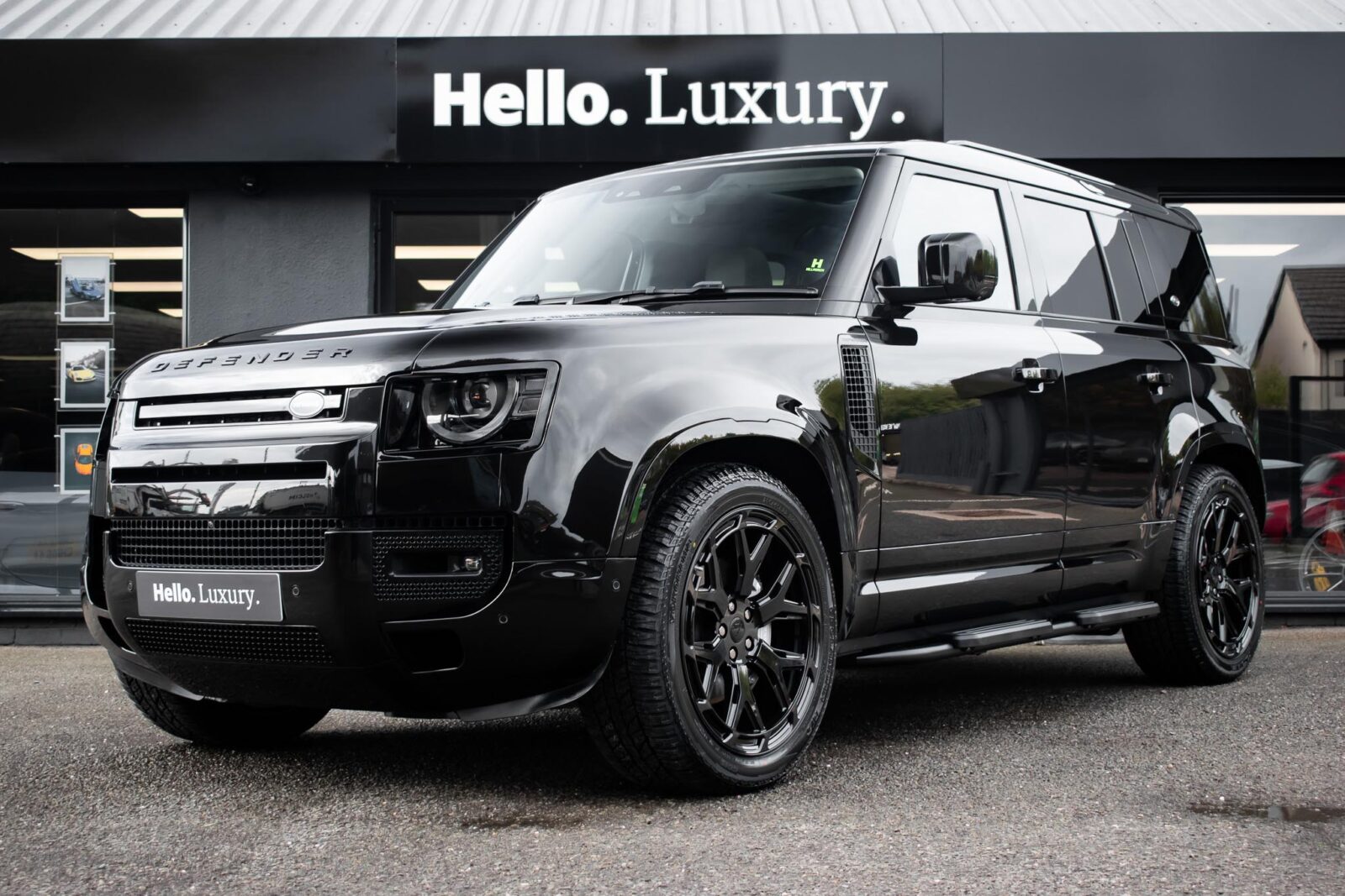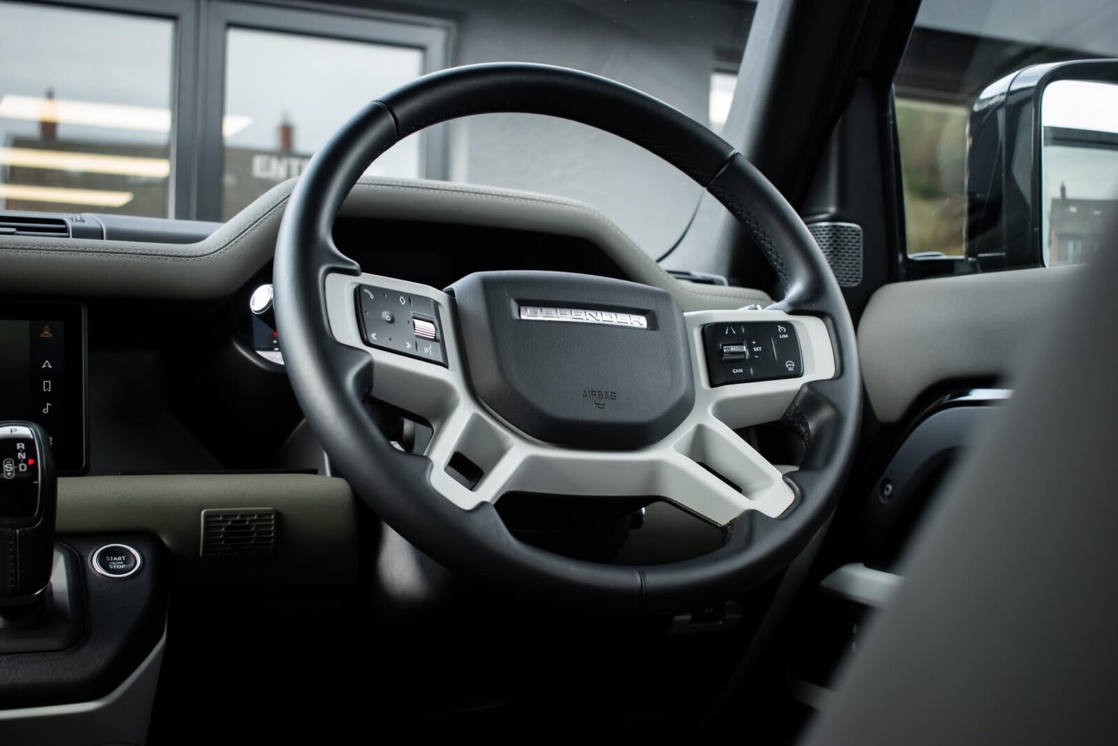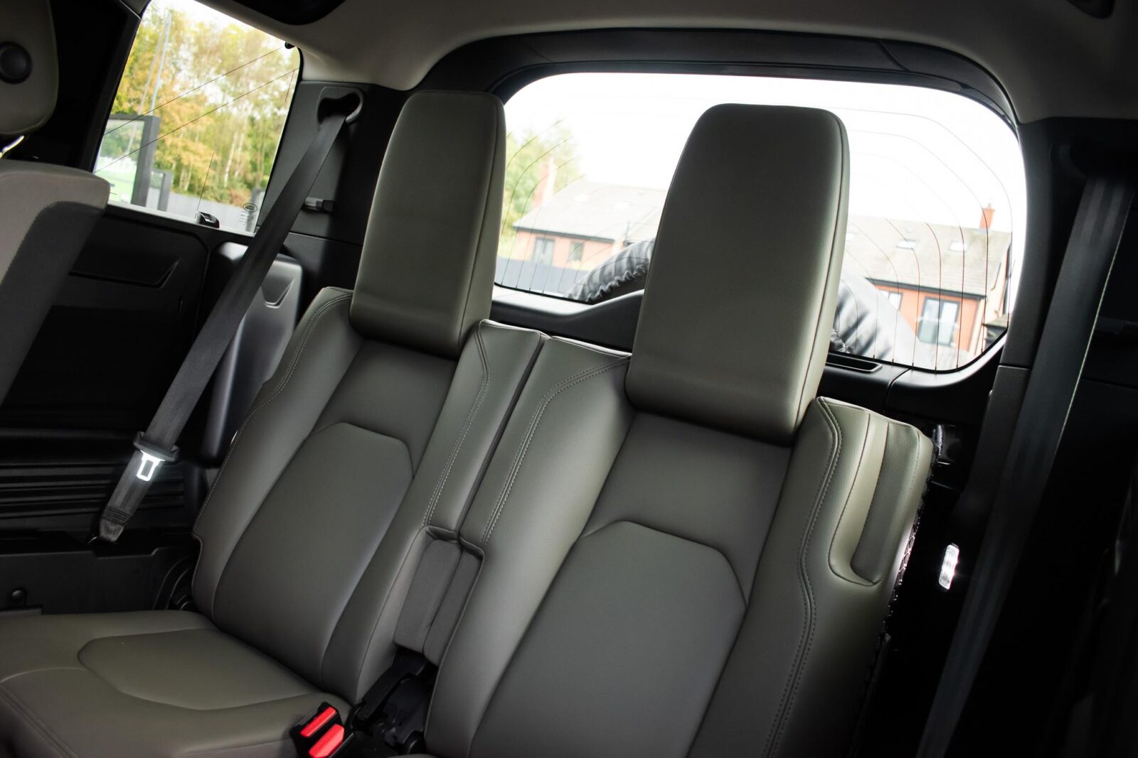 Santorini Black metallic. 7 seat configuration. Khaki perforated Taurus leather front electric seats with lumbar support, heated/cooled front seats, 3 zone climate control, cabin air ionisation / PM2.5, cruise control, 10″ infotainment touch screen, interior smart view mirror, satellite navigation, media interface, Bluetooth, DAB radio, Apple CarPlay, Android Auto, Meridian surround sound, voice activated controls, multi-function heated leather steering wheel, front armrest with coolbox, Light Oyster Morzine headlining, sliding panoramic roof, Black roof rails, Black pack, 22″ Hawke Havoc gloss black alloy wheels with new Yokohama tyres, Hawke fixed side steps in black, Hawke rear spoiler, Black spare wheel cover, Signature Matrix LED headlights with DRL, illuminated tread plates, privacy glass, heated windscreen, keyless entry and ignition, electric steering column adjustment, blind spot assist, lane keep assist and upcoming traffic, reverse traffic detection, clear exit detection, adaptive speed limiter, 360 camera with front and rear parking sensors, continuous variable damping, water wading aid. Balance of Land Rover extended warranty till 08/04/2026.