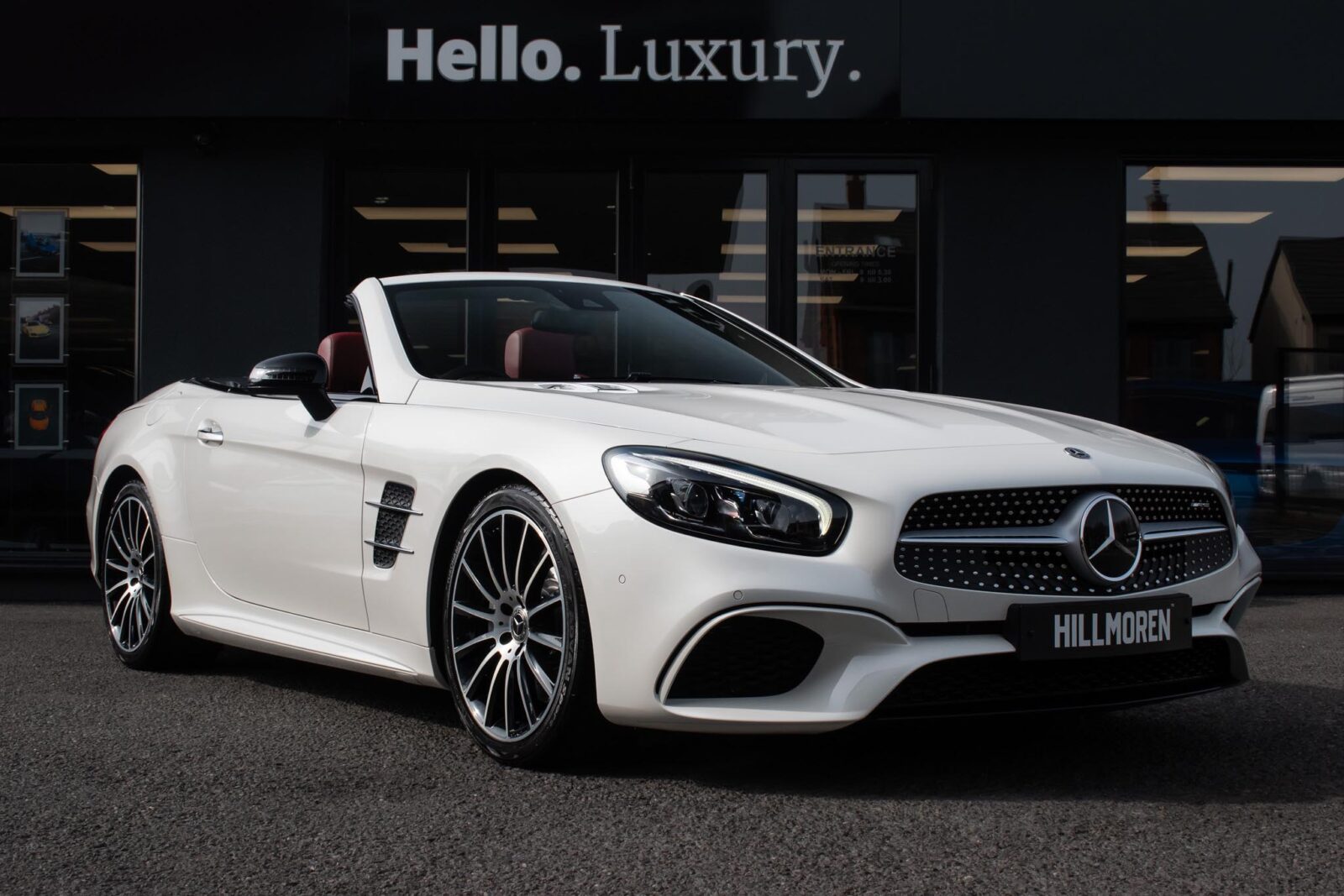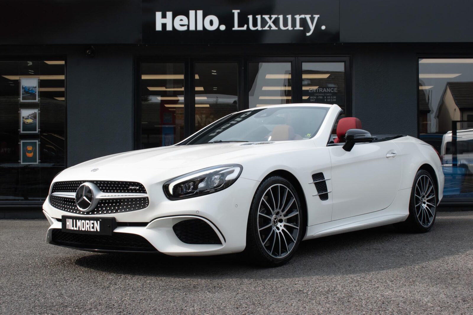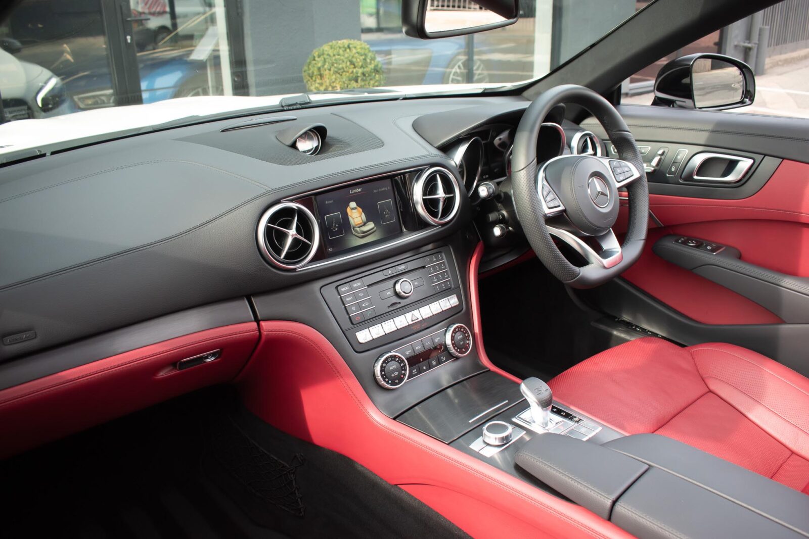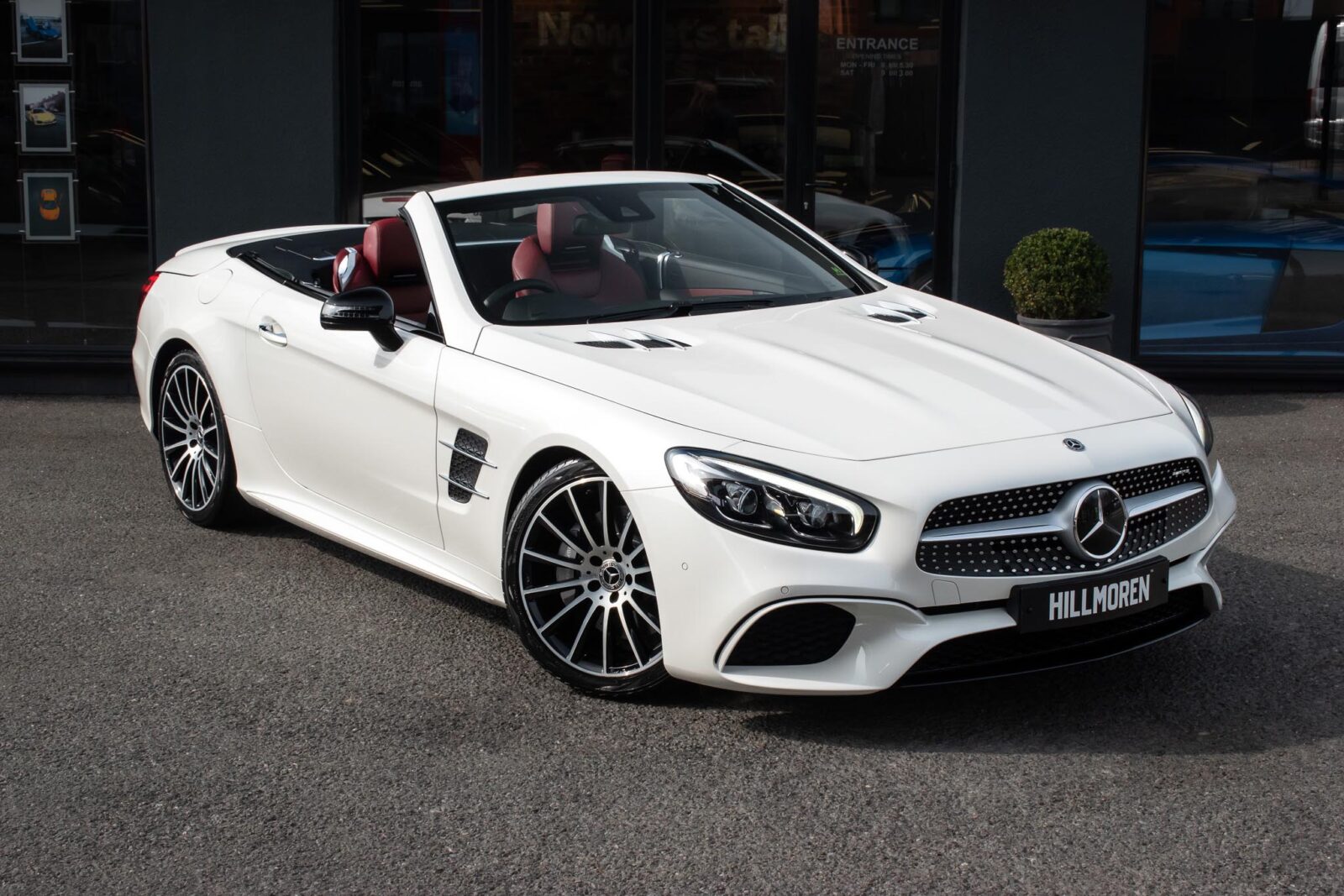 Diamond White metallic. Red perforated leather interior, electric adjustable seats with memory function, heated and ventilated front seats, climate control, cruise control, Comand with satellite navigation, Bluetooth, media interface, DVD player, DAB radio, Apple CarPlay, Android Auto, MB Connect, multifunction steering wheel, Harman / Kardon premium sound system, AMG exterior night package, AMG body styling package, 19 inch AMG multi-spoke alloy wheels, AMG sports package, switchable exhaust, sport suspension, panoramic folding hard top, heated windscreen washers, airscarf system, electric wind deflector, interior and exterior auto dimming mirror, dark aluminium look interior trim, power fold mirrors, mirror puddle lights, collision warning system with active brake, automatic high beam plus, LED dynamic headlamps, traffic sign recognition, ambient lighting, illuminated door sill, AMG floor mats, front and rear parking sensors, keyless go, tyre pressure monitoring. Full service history.