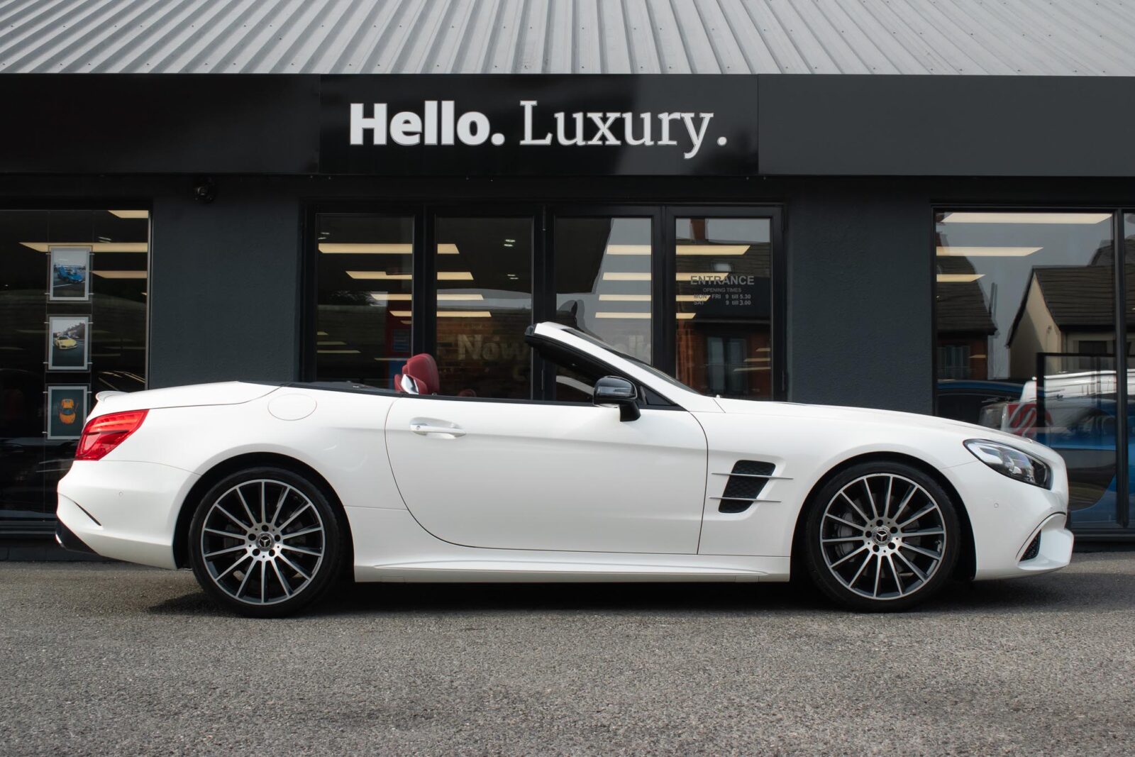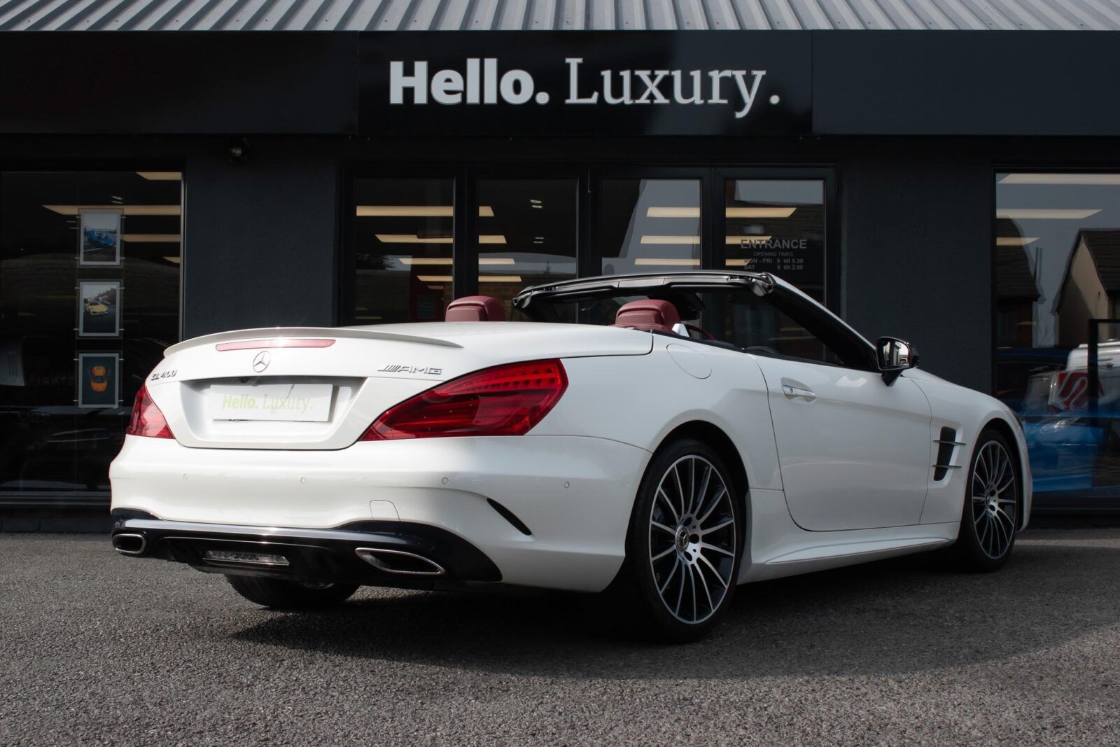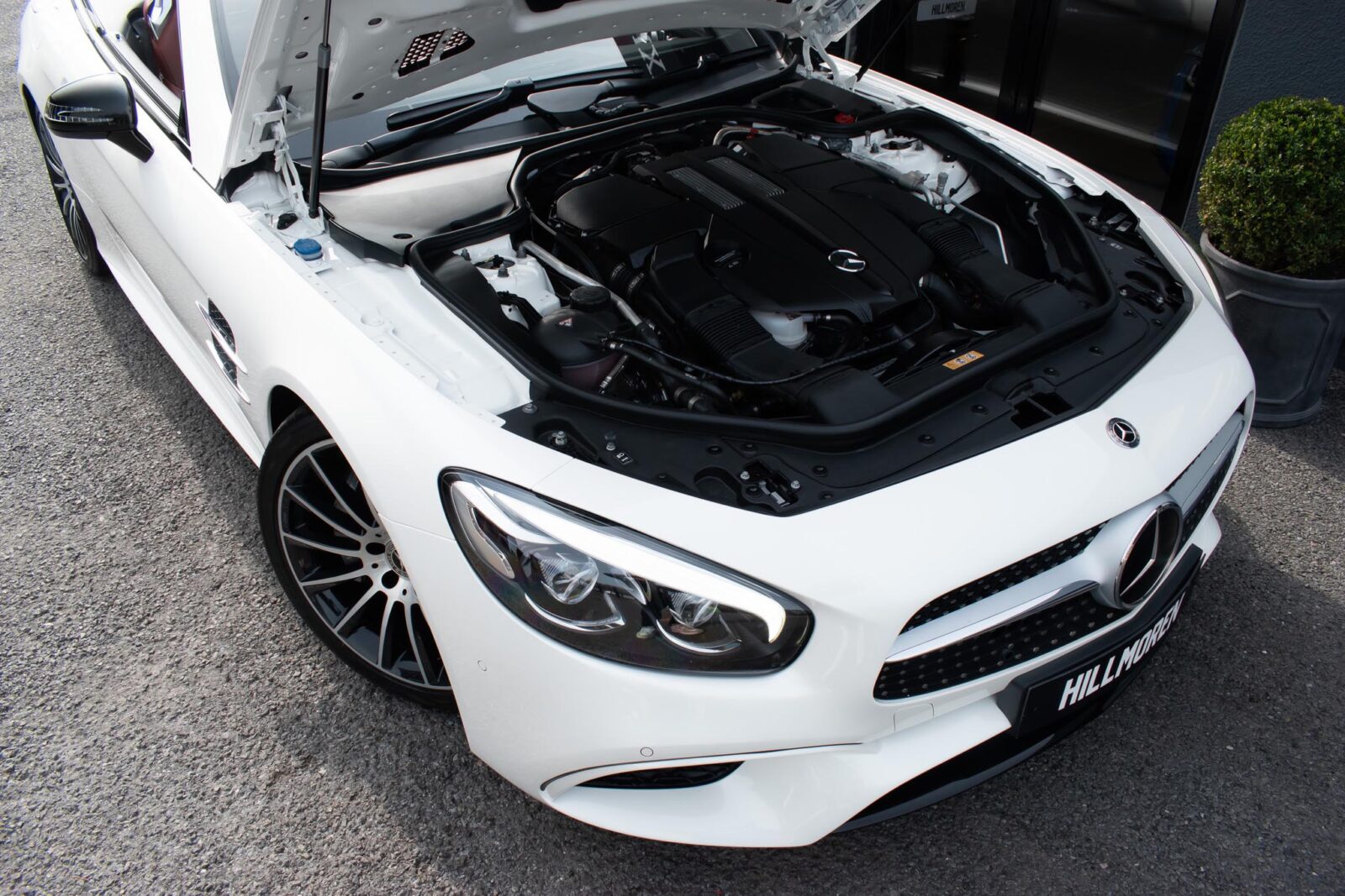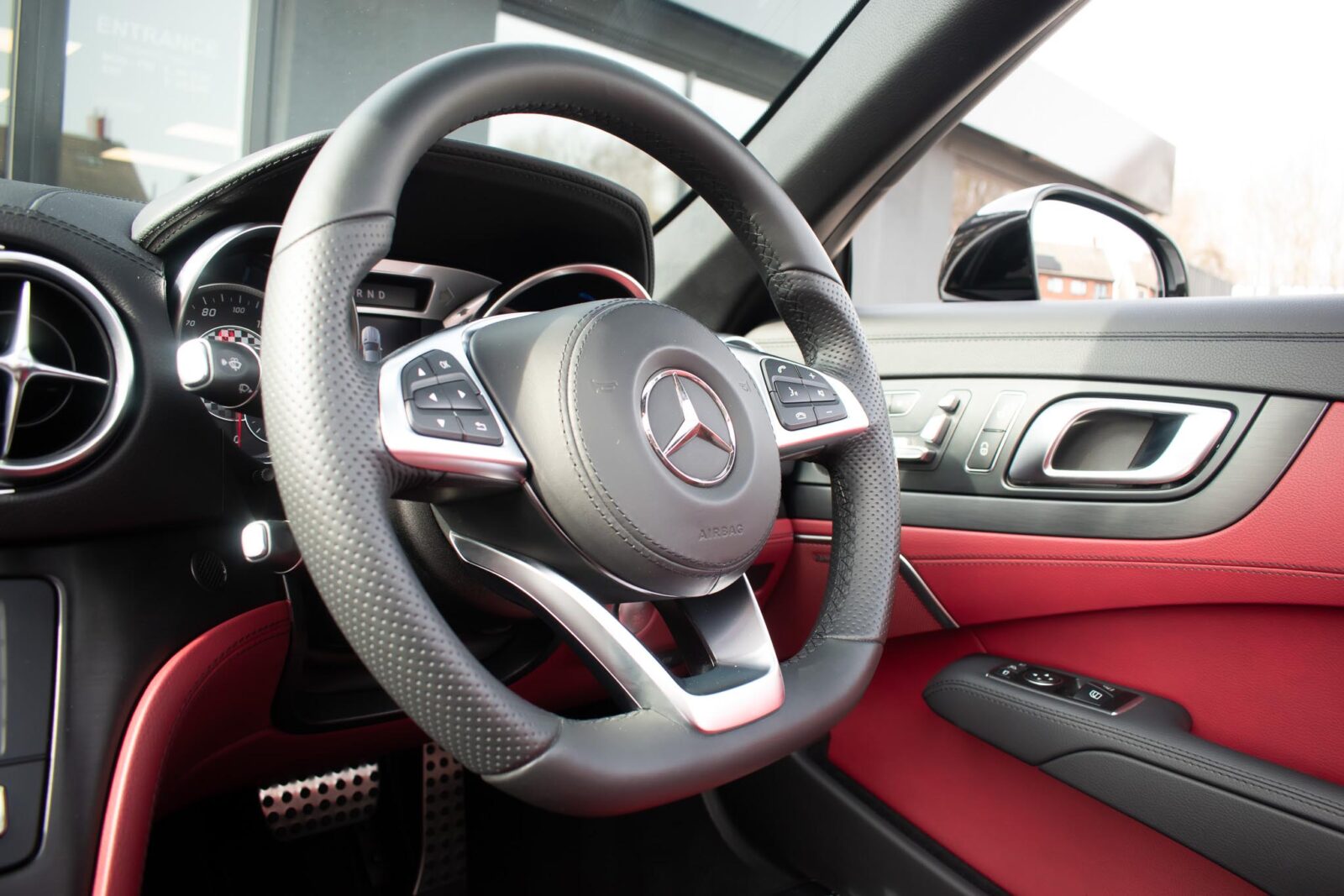 Diamond White metallic. Red perforated leather interior, electric adjustable seats with memory function, heated and ventilated front seats, climate control, cruise control, Comand with satellite navigation, Bluetooth, media interface, DVD player, DAB radio, Apple CarPlay, Android Auto, MB Connect, multifunction steering wheel, Harman / Kardon premium sound system, AMG exterior night package, AMG body styling package, 19 inch AMG multi-spoke alloy wheels, AMG sports package, switchable exhaust, sport suspension, panoramic folding hard top, heated windscreen washers, airscarf system, electric wind deflector, interior and exterior auto dimming mirror, dark aluminium look interior trim, power fold mirrors, mirror puddle lights, collision warning system with active brake, automatic high beam plus, LED dynamic headlamps, traffic sign recognition, ambient lighting, illuminated door sill, AMG floor mats, front and rear parking sensors, keyless go, tyre pressure monitoring. Full service history.