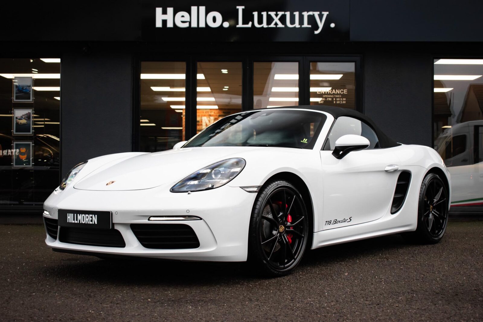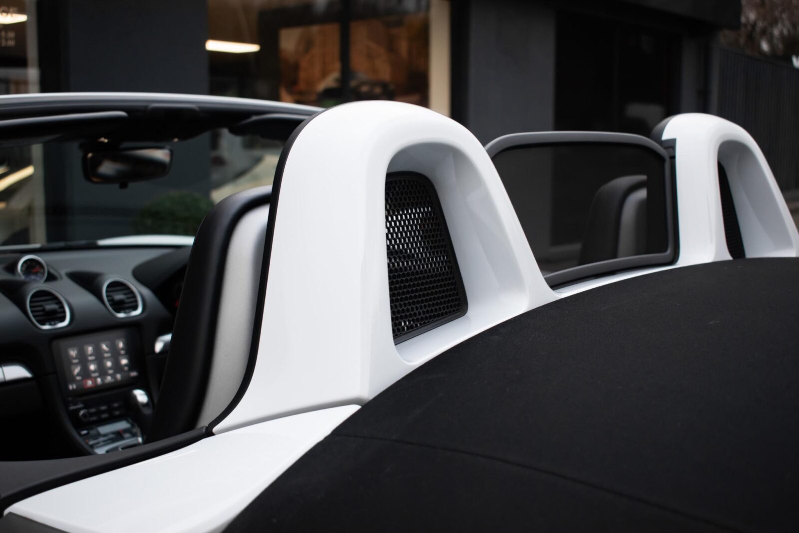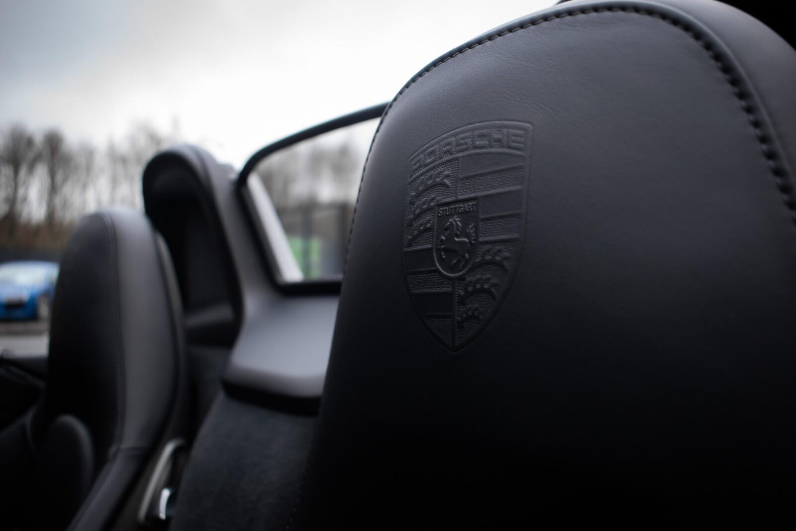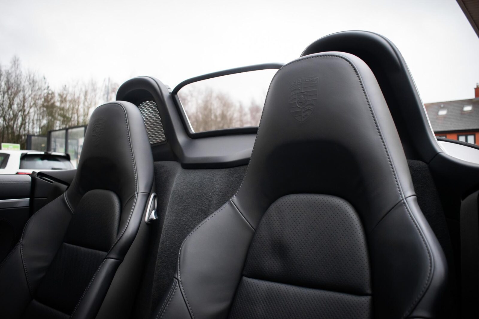 Carrara White metallic. Black Hood. Black leather interior, extended leather to dashboard and door panels, 2-way electric sport seats plus, heated seats, heated multi-function steering wheel with gear shift, PCM with satellite navigation, BOSE surround sound, DAB, Apple CarPlay, climate control, cruise control, 20″ Carrera S alloy wheels finished in satin black, LED main headlights including PDLS plus, Sport Chrono package with mode switch, sports exhaust with silver tips, roll-over bars finished in Carrara White, power fold mirrors, front and rear park assist, Porsche crest embossed headrests. Tracker. Official Porsche centre service history. Balance of Porsche warranty expires December 2027.