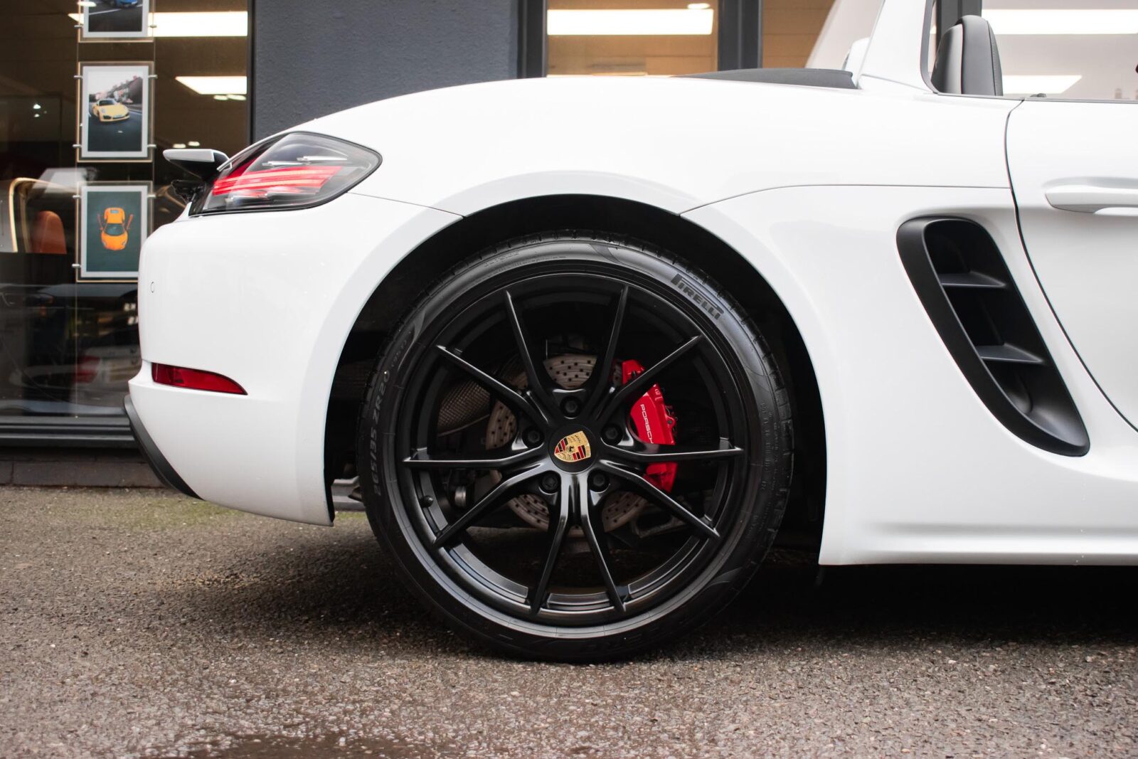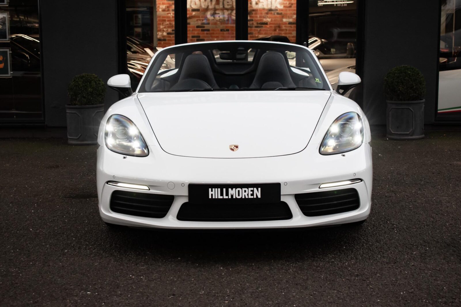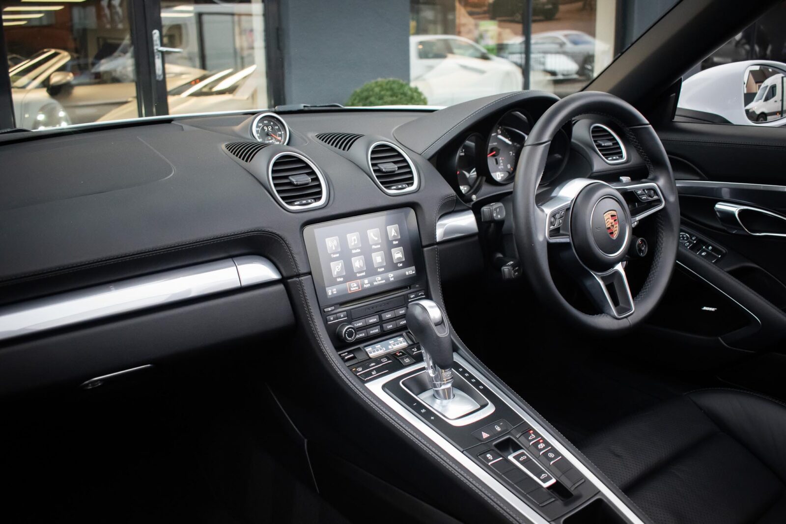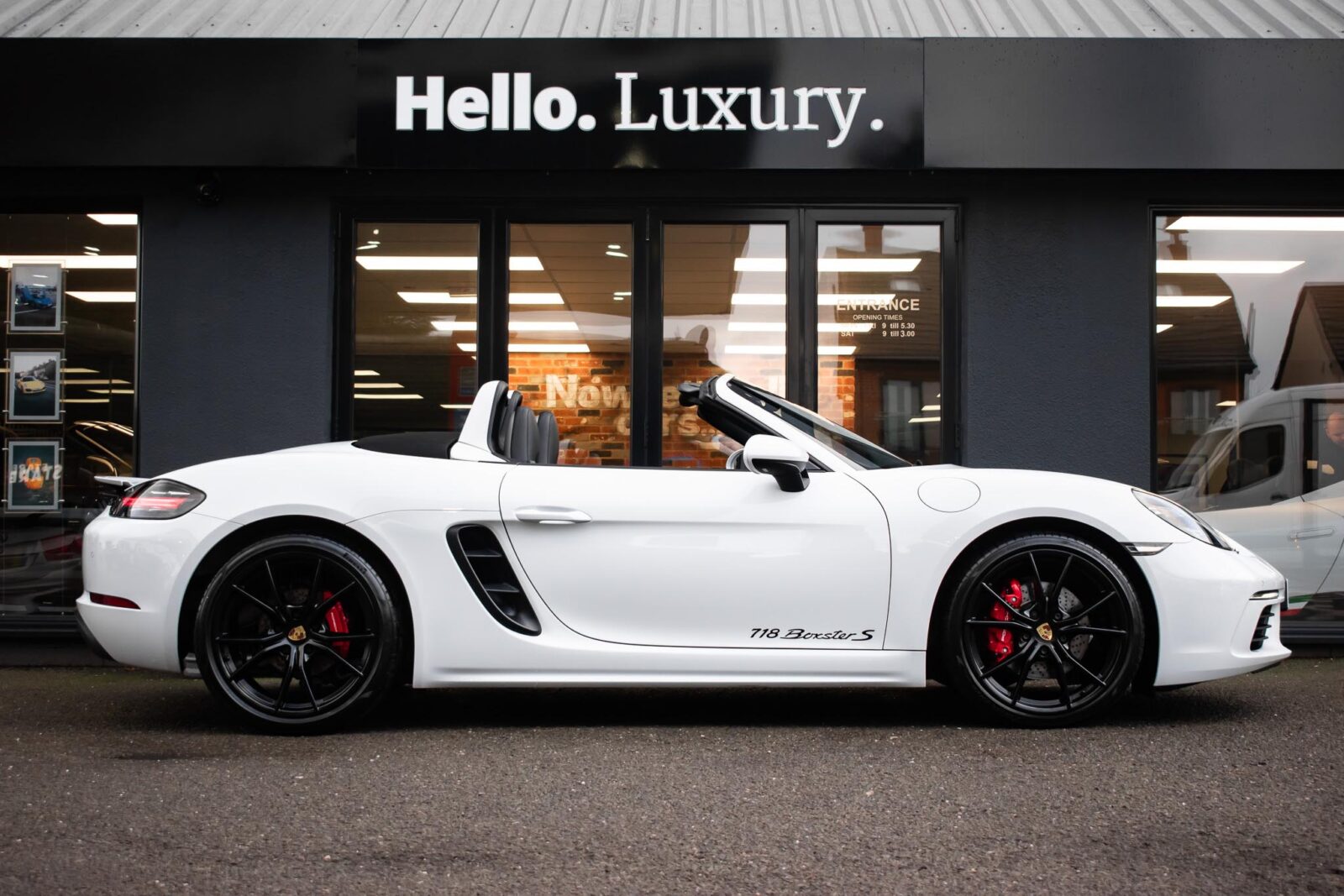 Carrara White metallic. Black Hood. Black leather interior, extended leather to dashboard and door panels, 2-way electric sport seats plus, heated seats, heated multi-function steering wheel with gear shift, PCM with satellite navigation, BOSE surround sound, DAB, Apple CarPlay, climate control, cruise control, 20″ Carrera S alloy wheels finished in satin black, LED main headlights including PDLS plus, Sport Chrono package with mode switch, sports exhaust with silver tips, roll-over bars finished in Carrara White, power fold mirrors, front and rear park assist, Porsche crest embossed headrests. Tracker. Official Porsche centre service history. Balance of Porsche warranty expires December 2027.