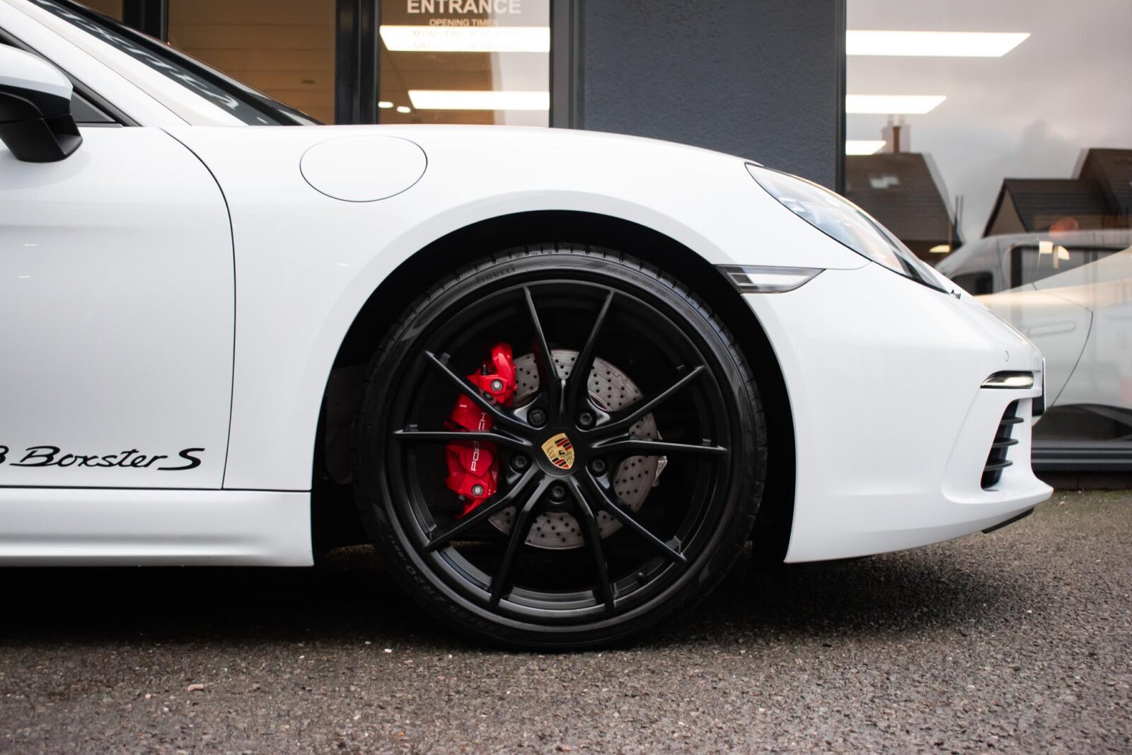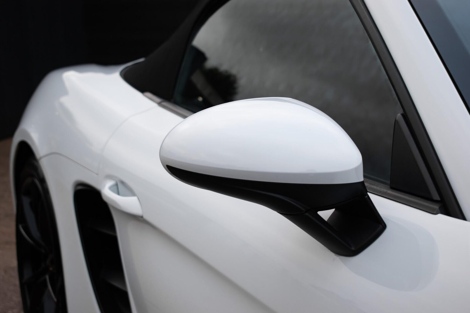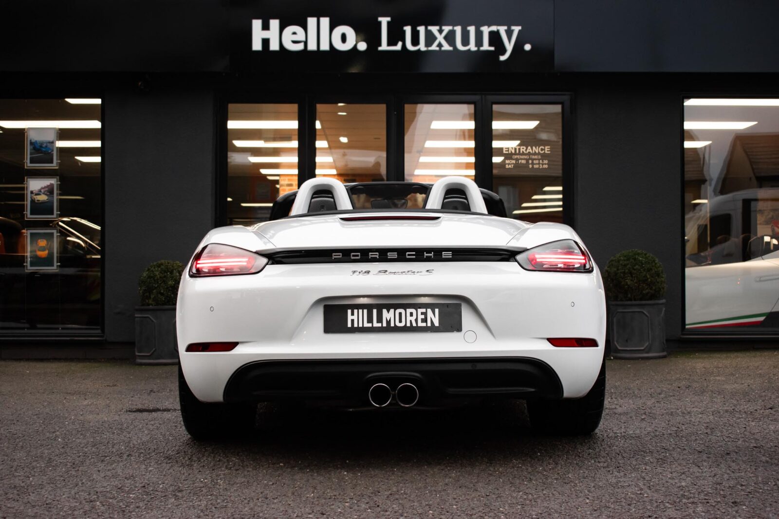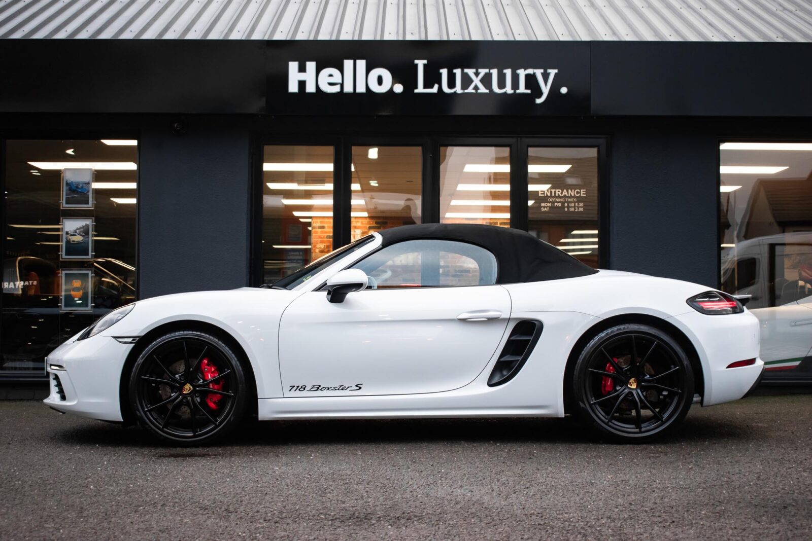 Carrara White metallic. Black Hood. Black leather interior, extended leather to dashboard and door panels, 2-way electric sport seats plus, heated seats, heated multi-function steering wheel with gear shift, PCM with satellite navigation, BOSE surround sound, DAB, Apple CarPlay, climate control, cruise control, 20″ Carrera S alloy wheels finished in satin black, LED main headlights including PDLS plus, Sport Chrono package with mode switch, sports exhaust with silver tips, roll-over bars finished in Carrara White, power fold mirrors, front and rear park assist, Porsche crest embossed headrests. Tracker. Official Porsche centre service history. Balance of Porsche warranty expires December 2027.