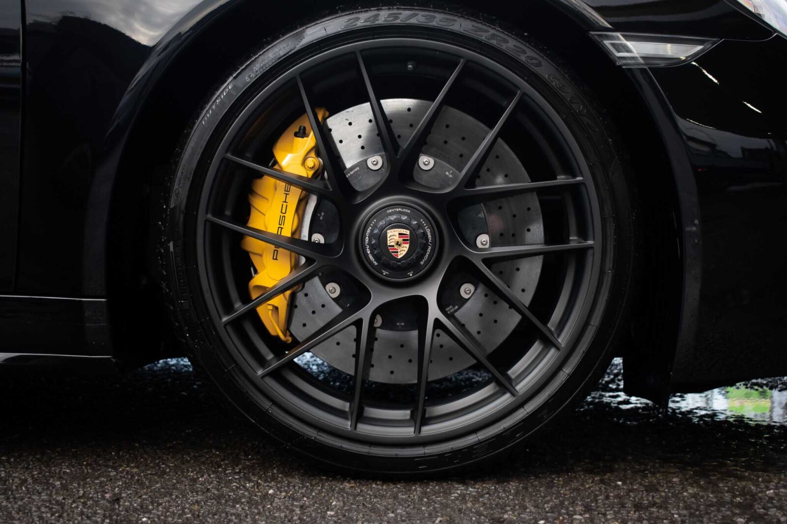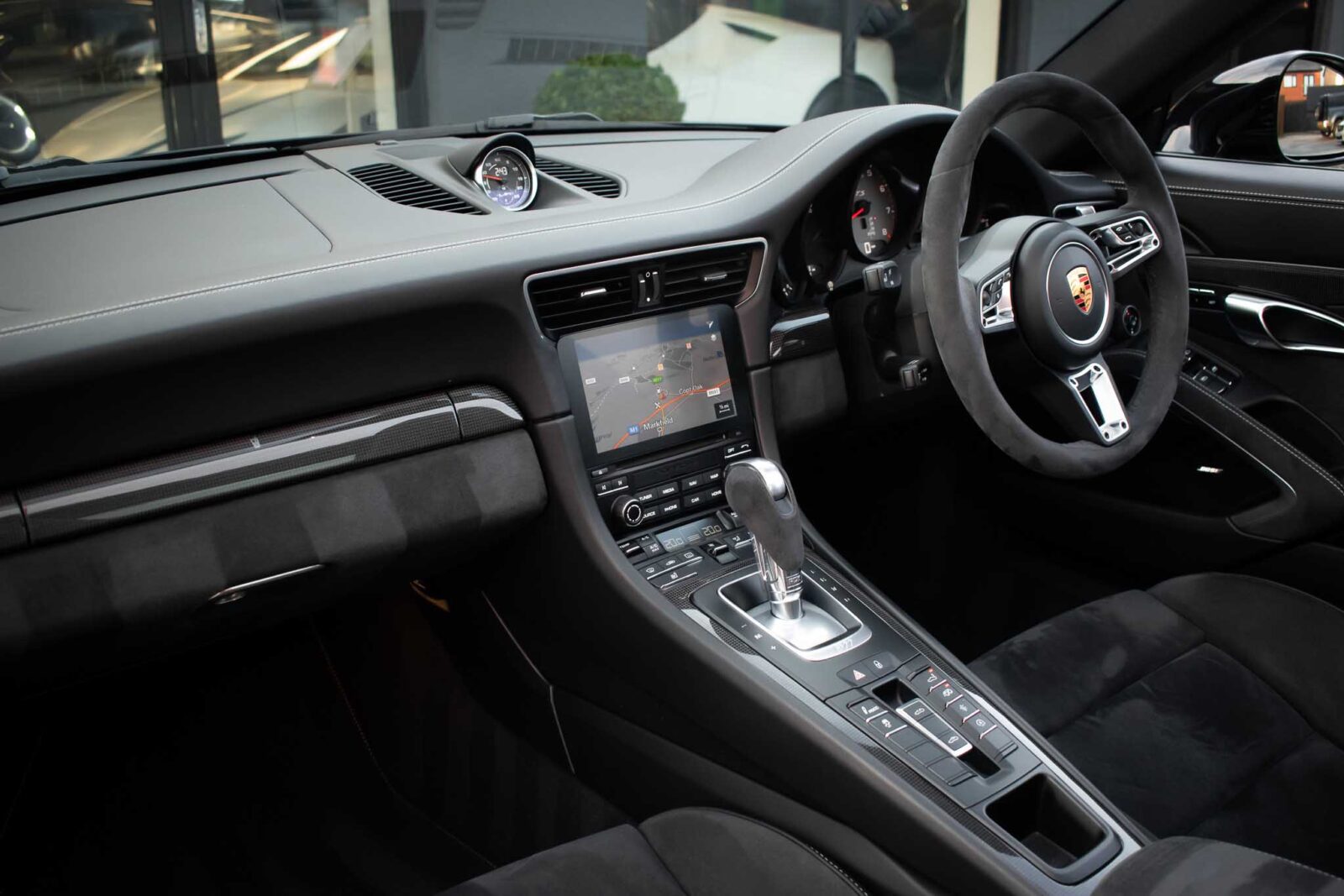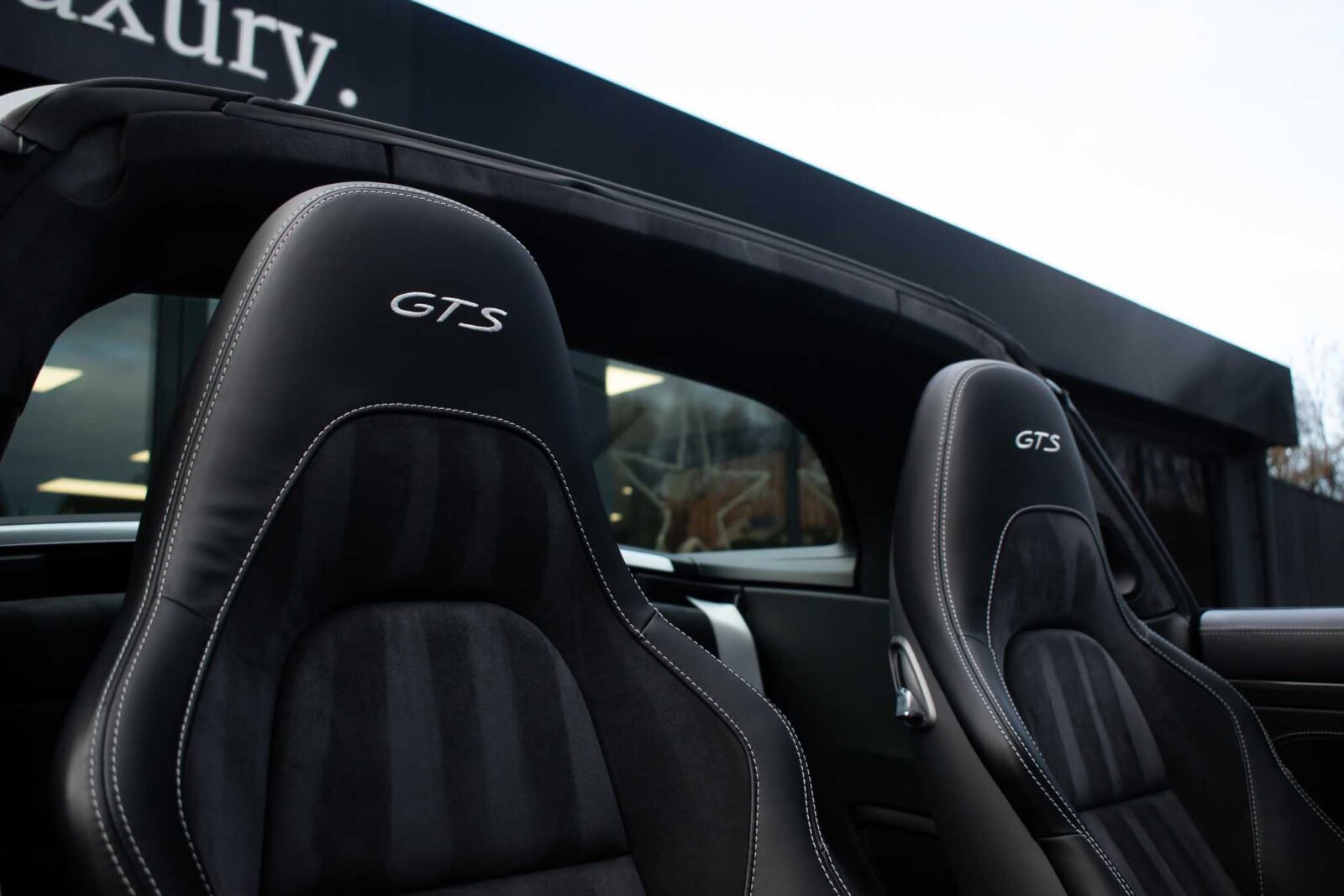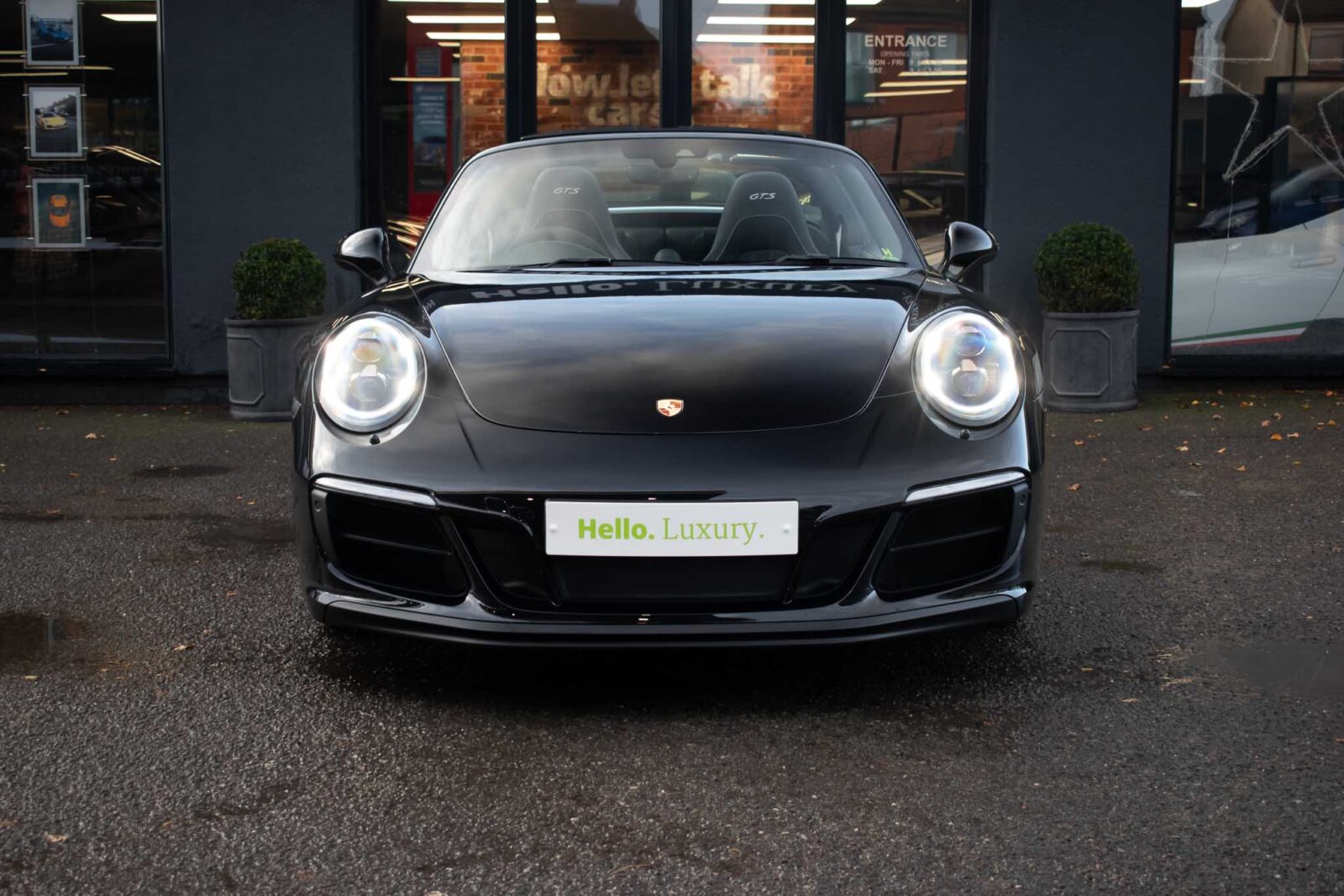 Jet Black metallic. GTS Interior package with Rhodium Silver contrast stitching, full electric 18 way adaptive seats with lumbar support and memory function, climate control, cruise control, Carbon Fibre interior trim, BOSE surround sound, Apple CarPlay, front axle lift, rear axle steer, Porsche Dynamic Chassis Control, Porsche Carbon Composite braking system with Yellow calipers, auto headlights with rain sensing wipers, LED main headlights with PDLS plus, heated seats, heated Race-Tex steering wheel, Black powered retractable soft top, 911 Turbo S centre lock alloy wheels finished in Satin Black, switchable sports exhaust system, power steering plus, coloured seatbelts, painted side skirts and rear bumper apron, parking sensors with reverse camera. Tracker. Paint protection film applied to the whole of the car. Official Porsche centre service history. Balance of Porsche approved used car warranty expires June 2026.