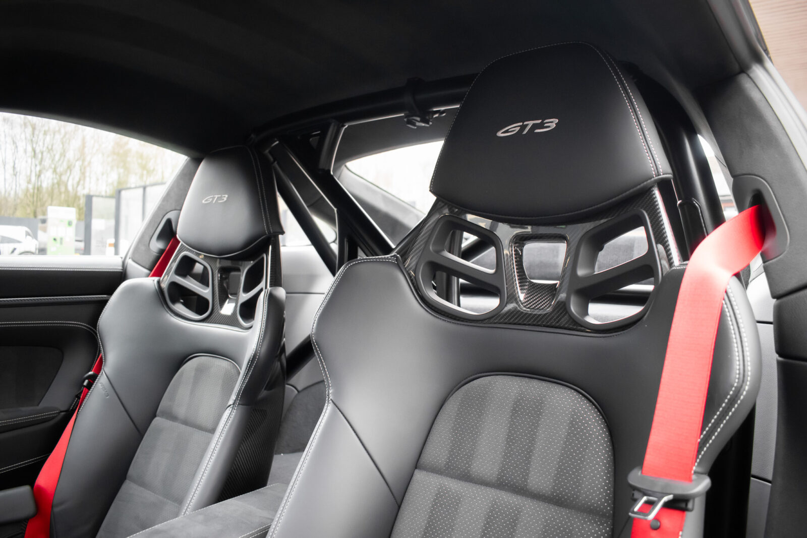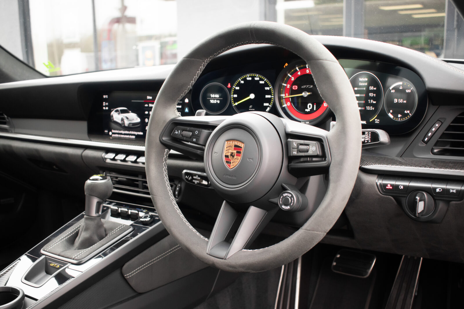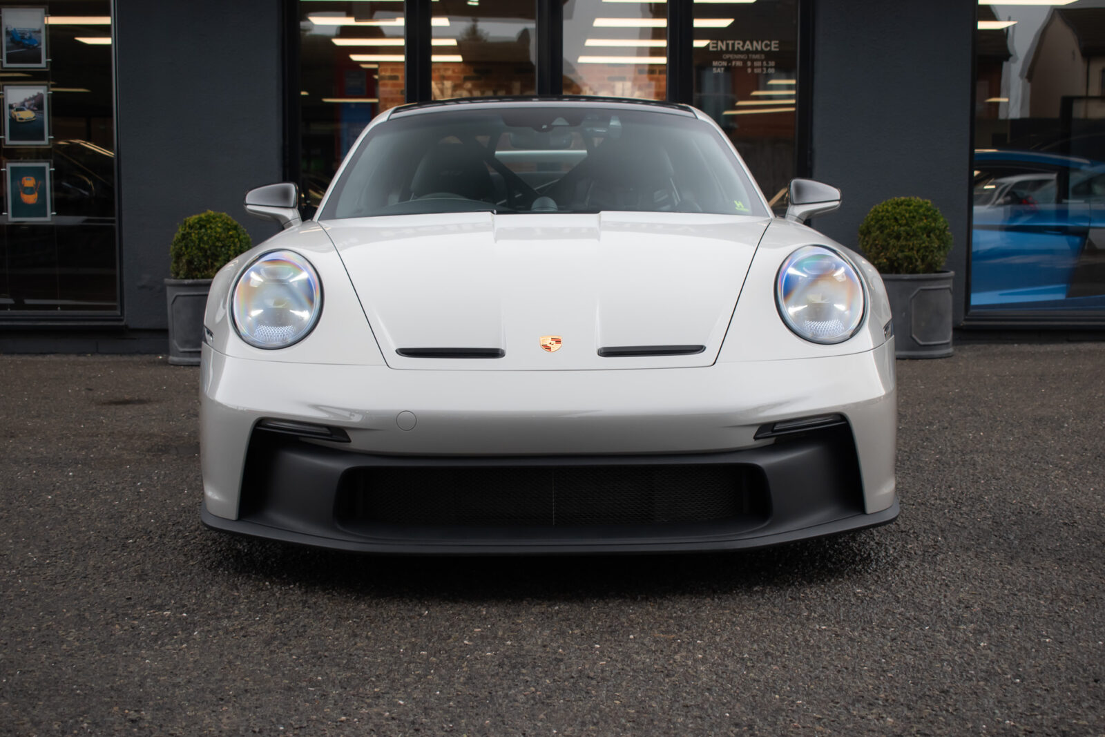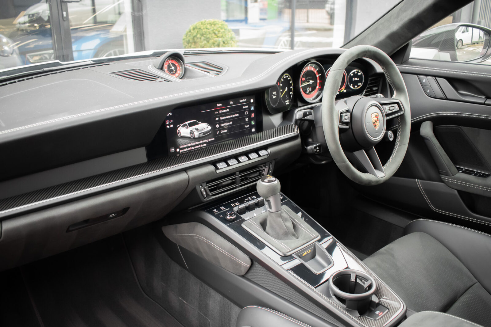 Crayon Grey. Extensive leather / Race-Tex items in Black with contrasting silver stitching, dashboard and door trims package in leather, Carbon Fibre lightweight buckets, drivers 6 point harness, Club Sport Package with additional road legal 1kg fire extinguisher, front axle lifting system, Carbon Fibre interior package, Chrono package including preparation for the lap trigger, Sport Chrono stopwatch instrument dial in Guards Red, rev counter in Guards Red, lightweight Carbon Fibre roof, exterior mirror upper trims in Carbon fibre with bases in exterior colour, wheels painted silver, LED Main Headlights in black with Matrix Beam including Porsche Dynamic Light System Plus (PDLS plus), light design Package, Exclusive Design taillights, Exclusive Design fuel filler cap, side model logo in black, sports exhaust, rear park assist with reversing camera, BOSE Surround Sound System, Guards Red seat belts, Race-Tex sun visors, storage compartment lid in Race-Tex, Porsche logo LED door courtesy lights, automatically dimming mirrors with integrated rain sensor. Tyre sealing compound and electric air compressor. Tracker. Porsche dash camera. Balance of Porsche warranty. Full PPF.