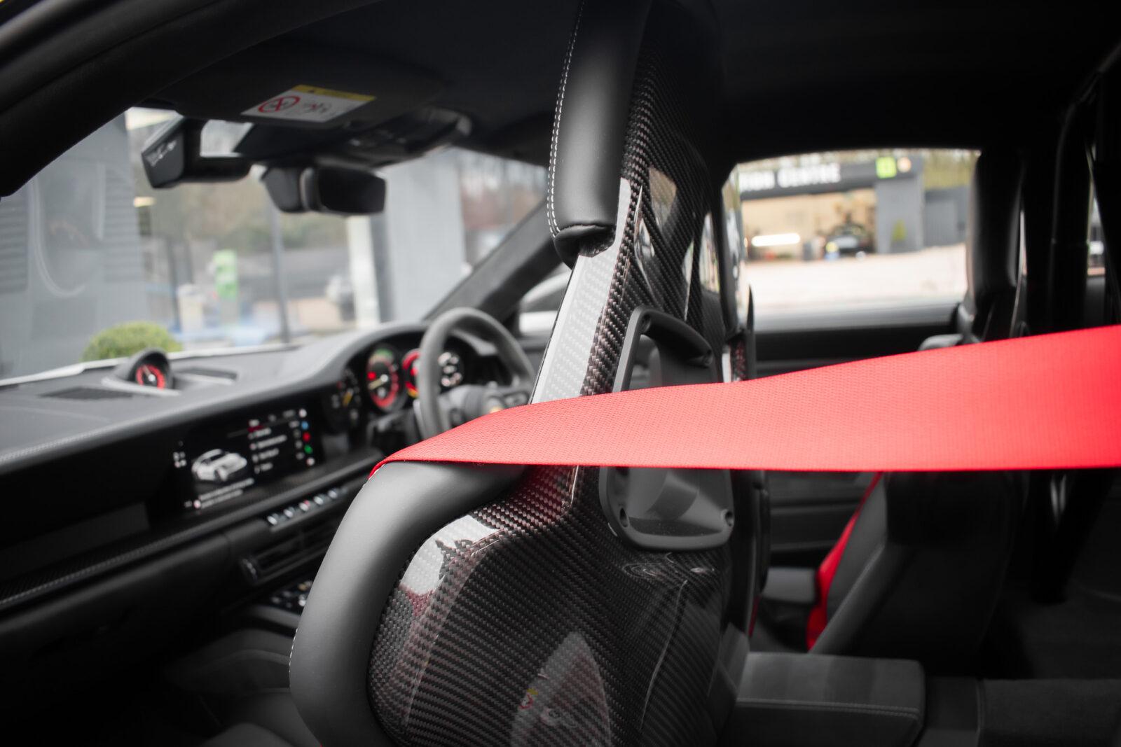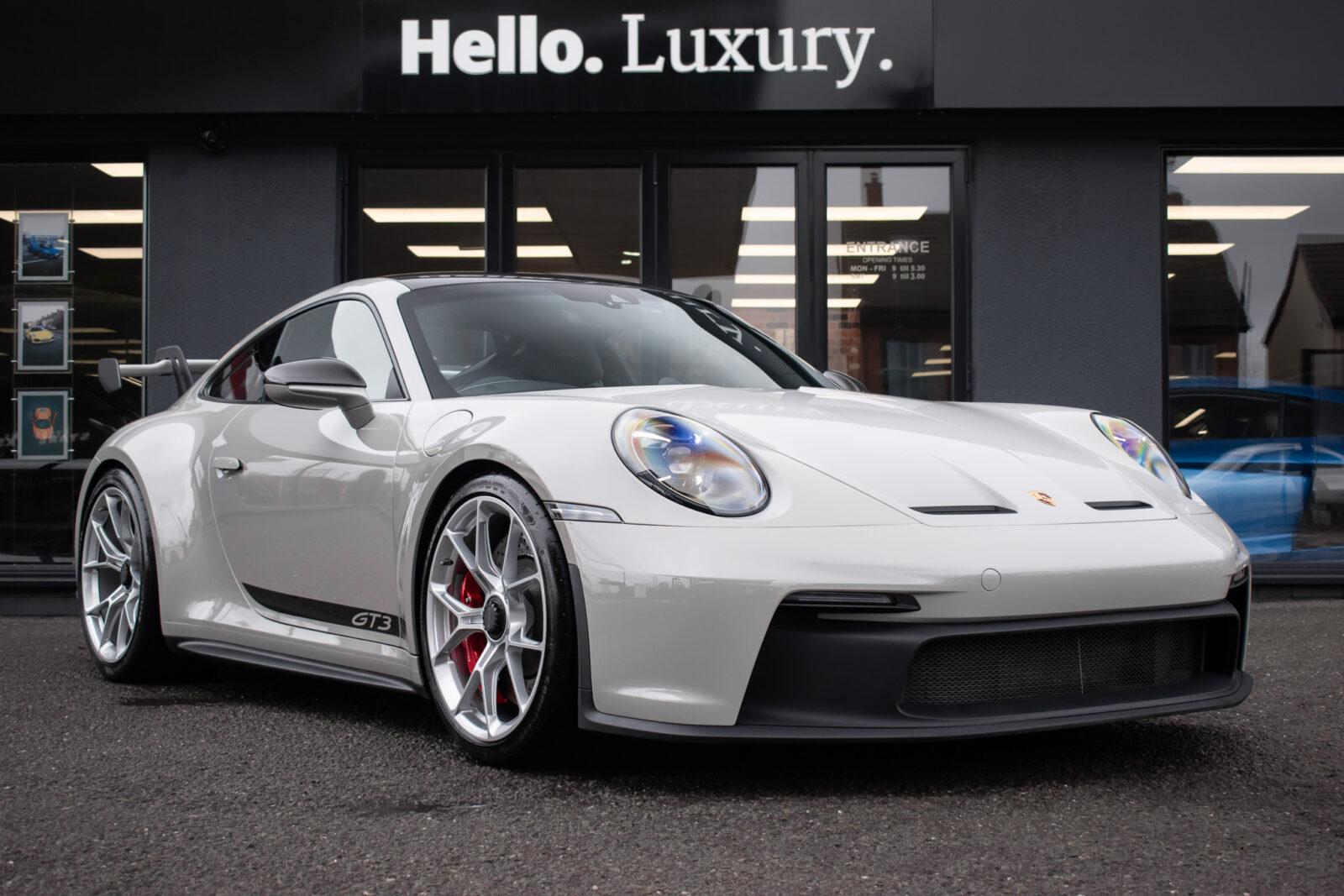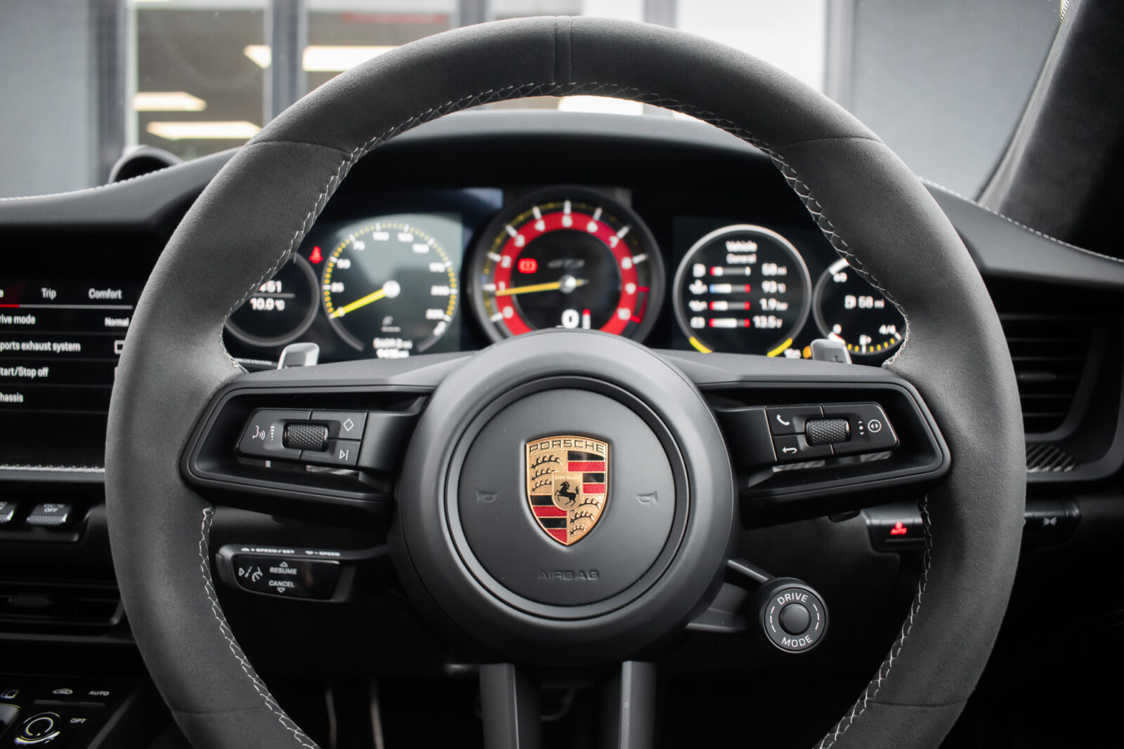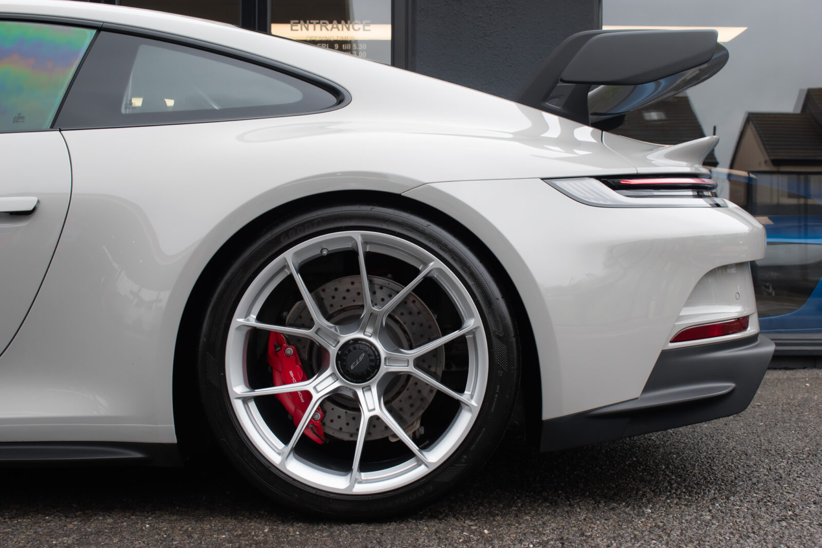 Crayon Grey. Extensive leather / Race-Tex items in Black with contrasting silver stitching, dashboard and door trims package in leather, Carbon Fibre lightweight buckets, drivers 6 point harness, Club Sport Package with additional road legal 1kg fire extinguisher, front axle lifting system, Carbon Fibre interior package, Chrono package including preparation for the lap trigger, Sport Chrono stopwatch instrument dial in Guards Red, rev counter in Guards Red, lightweight Carbon Fibre roof, exterior mirror upper trims in Carbon fibre with bases in exterior colour, wheels painted silver, LED Main Headlights in black with Matrix Beam including Porsche Dynamic Light System Plus (PDLS plus), light design Package, Exclusive Design taillights, Exclusive Design fuel filler cap, side model logo in black, sports exhaust, rear park assist with reversing camera, BOSE Surround Sound System, Guards Red seat belts, Race-Tex sun visors, storage compartment lid in Race-Tex, Porsche logo LED door courtesy lights, automatically dimming mirrors with integrated rain sensor. Tyre sealing compound and electric air compressor. Tracker. Porsche dash camera. Balance of Porsche warranty. Full PPF.