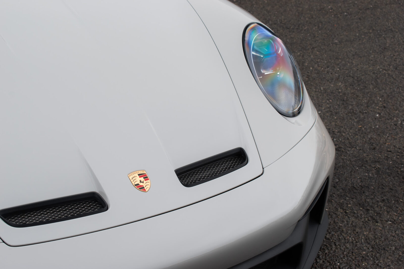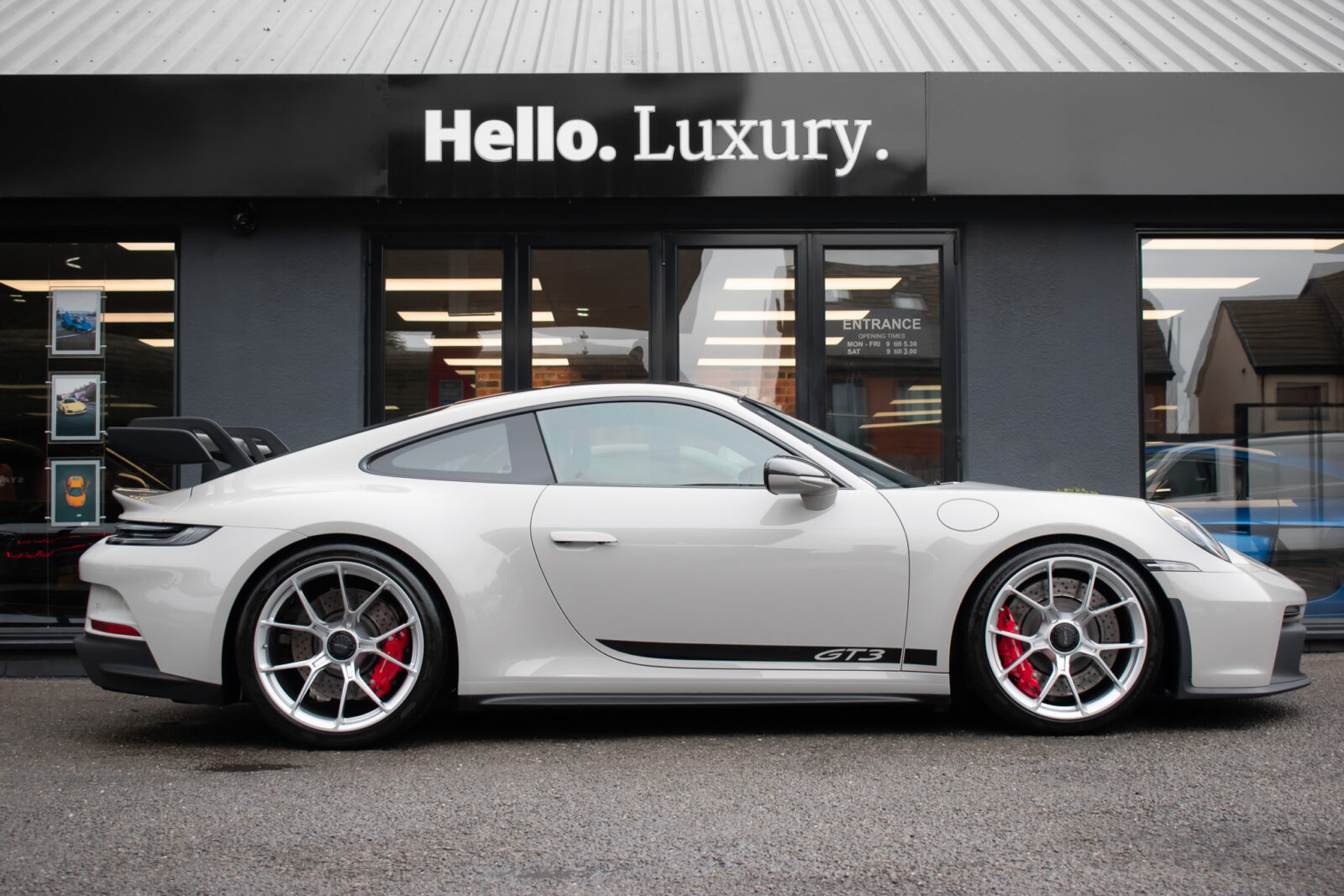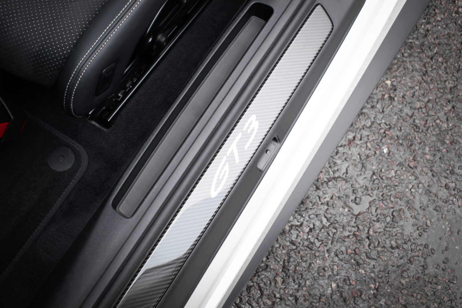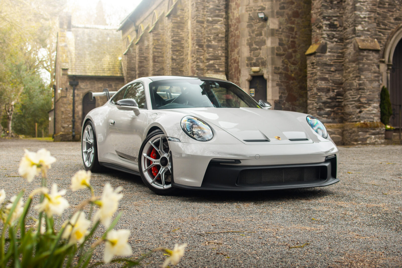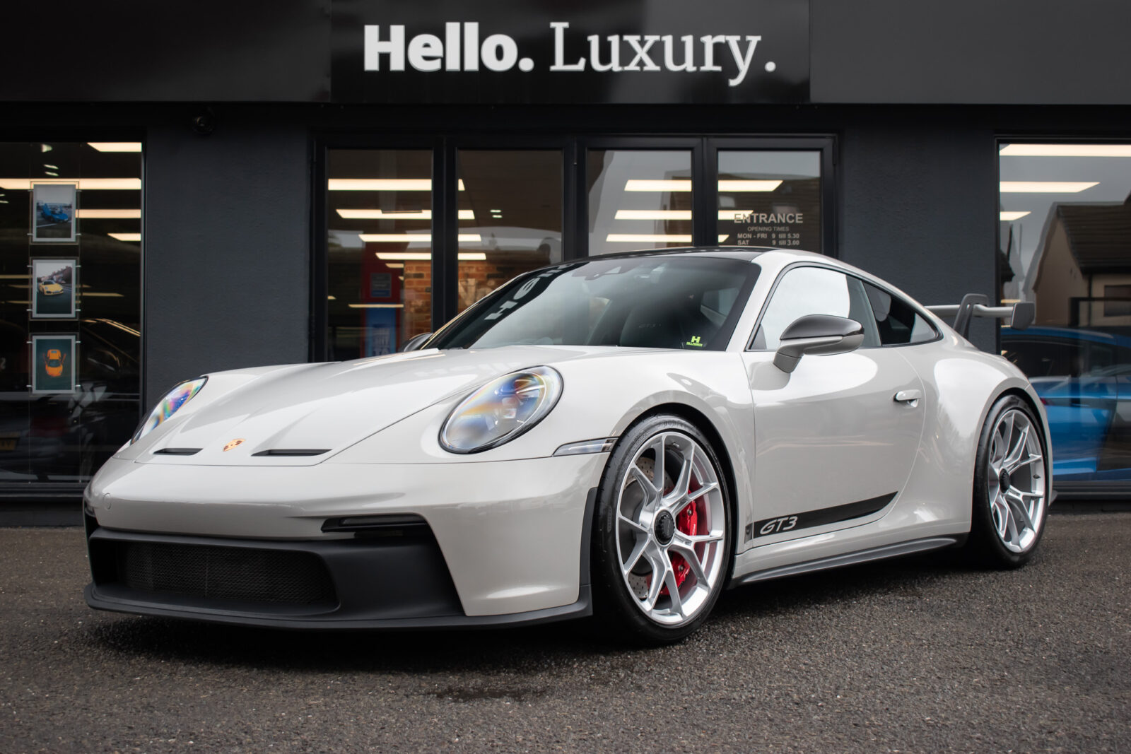 Crayon Grey. Extensive leather / Race-Tex items in Black with contrasting silver stitching, dashboard and door trims package in leather, Carbon Fibre lightweight buckets, drivers 6 point harness, Club Sport Package with additional road legal 1kg fire extinguisher, front axle lifting system, Carbon Fibre interior package, Chrono package including preparation for the lap trigger, Sport Chrono stopwatch instrument dial in Guards Red, rev counter in Guards Red, lightweight Carbon Fibre roof, exterior mirror upper trims in Carbon fibre with bases in exterior colour, wheels painted silver, LED Main Headlights in black with Matrix Beam including Porsche Dynamic Light System Plus (PDLS plus), light design Package, Exclusive Design taillights, Exclusive Design fuel filler cap, side model logo in black, sports exhaust, rear park assist with reversing camera, BOSE Surround Sound System, Guards Red seat belts, Race-Tex sun visors, storage compartment lid in Race-Tex, Porsche logo LED door courtesy lights, automatically dimming mirrors with integrated rain sensor. Tyre sealing compound and electric air compressor. Tracker. Porsche dash camera. Balance of Porsche warranty. Full PPF.