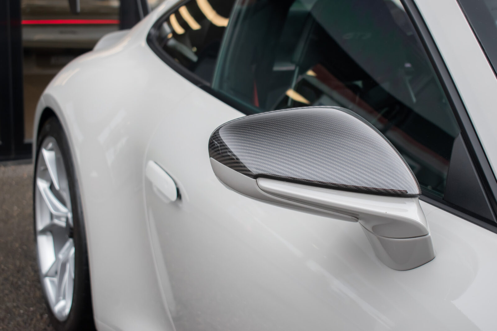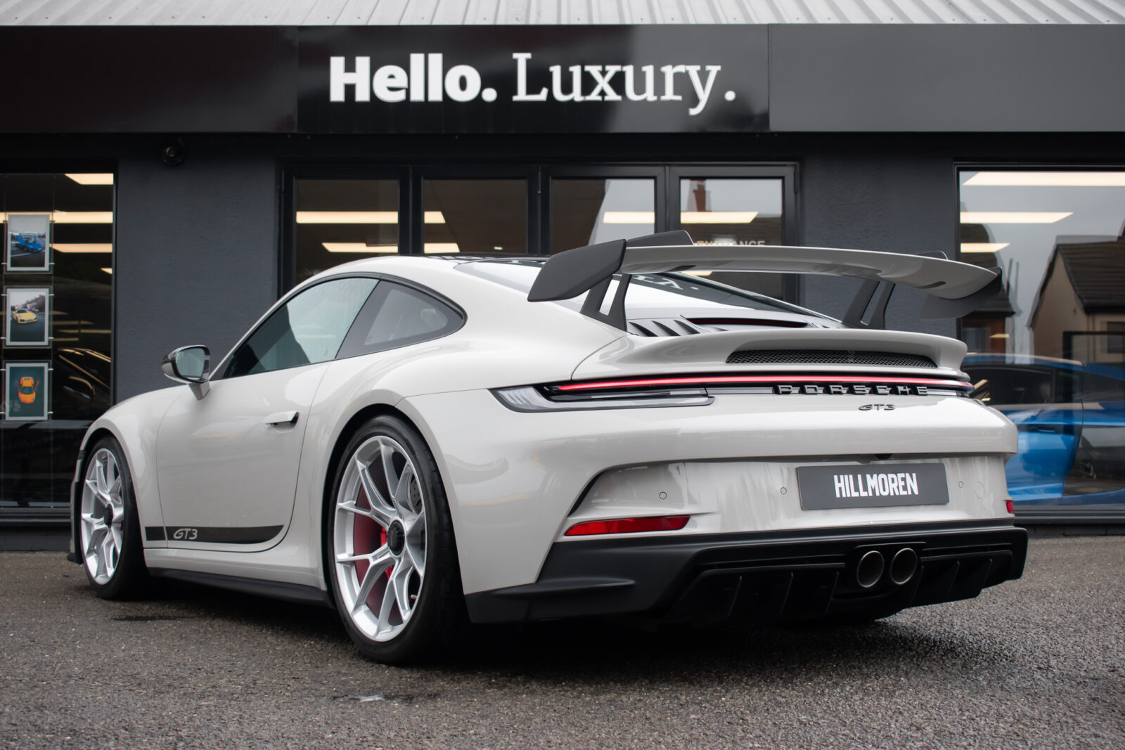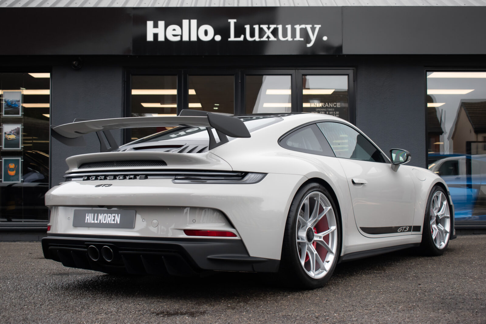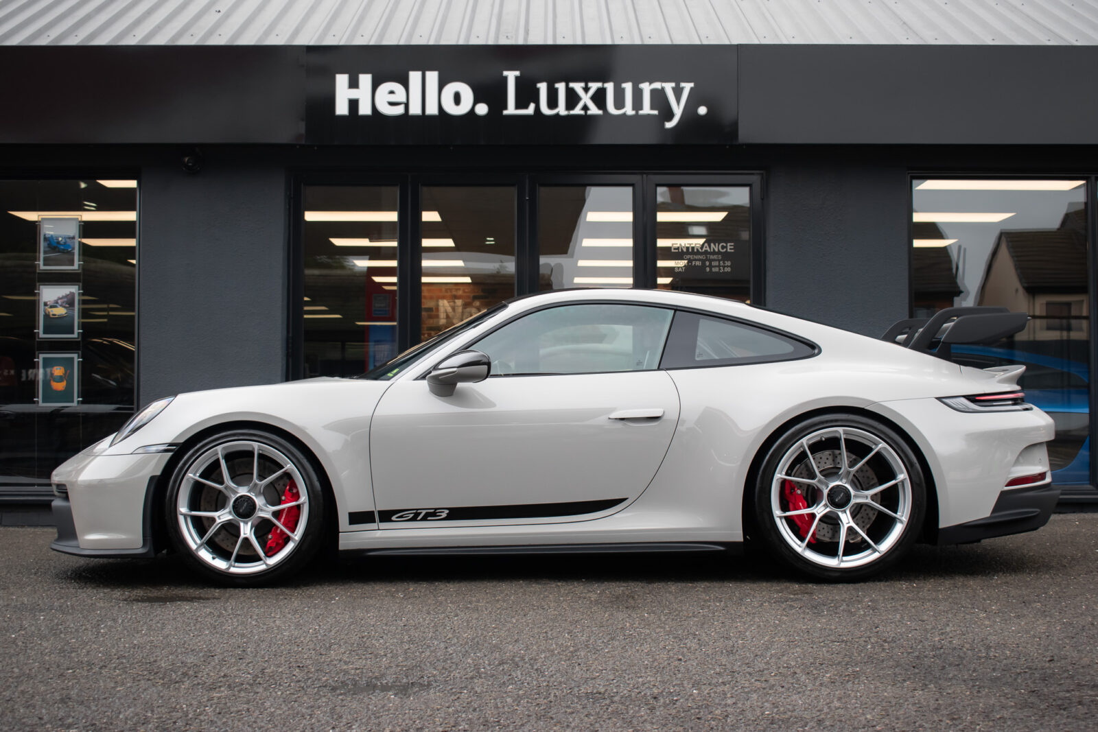 Crayon Grey. Extensive leather / Race-Tex items in Black with contrasting silver stitching, dashboard and door trims package in leather, Carbon Fibre lightweight buckets, drivers 6 point harness, Club Sport Package with additional road legal 1kg fire extinguisher, front axle lifting system, Carbon Fibre interior package, Chrono package including preparation for the lap trigger, Sport Chrono stopwatch instrument dial in Guards Red, rev counter in Guards Red, lightweight Carbon Fibre roof, exterior mirror upper trims in Carbon fibre with bases in exterior colour, wheels painted silver, LED Main Headlights in black with Matrix Beam including Porsche Dynamic Light System Plus (PDLS plus), light design Package, Exclusive Design taillights, Exclusive Design fuel filler cap, side model logo in black, sports exhaust, rear park assist with reversing camera, BOSE Surround Sound System, Guards Red seat belts, Race-Tex sun visors, storage compartment lid in Race-Tex, Porsche logo LED door courtesy lights, automatically dimming mirrors with integrated rain sensor. Tyre sealing compound and electric air compressor. Tracker. Porsche dash camera. Balance of Porsche warranty. Full PPF.