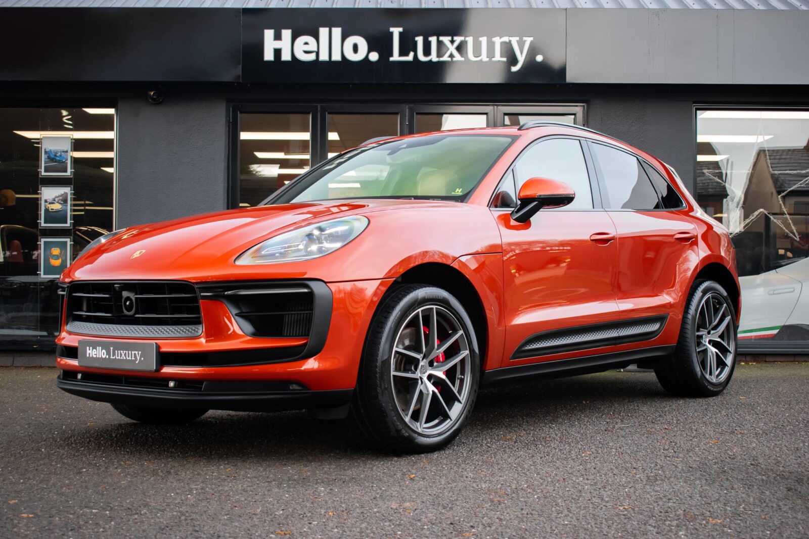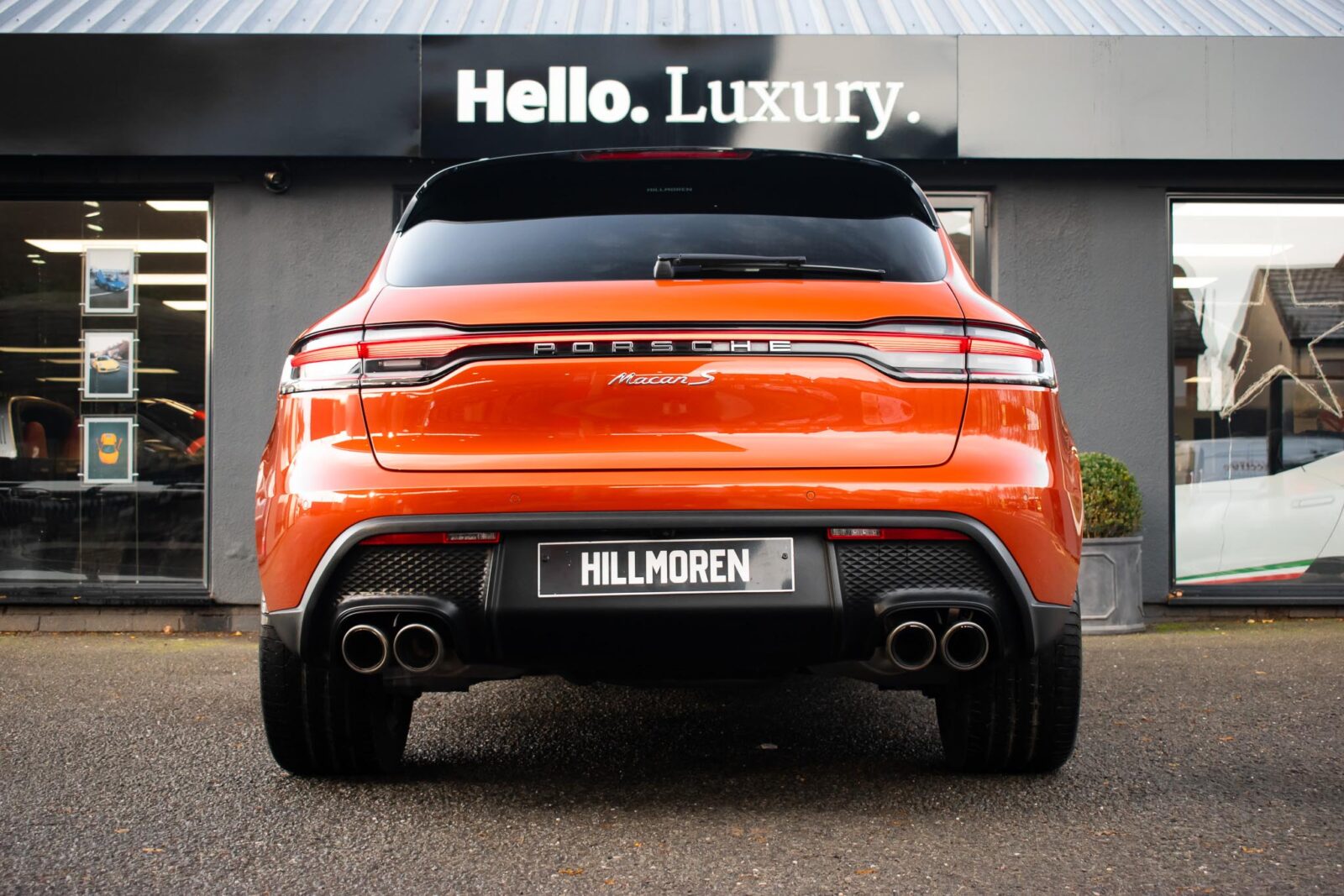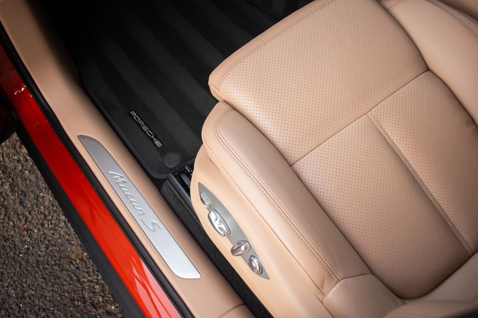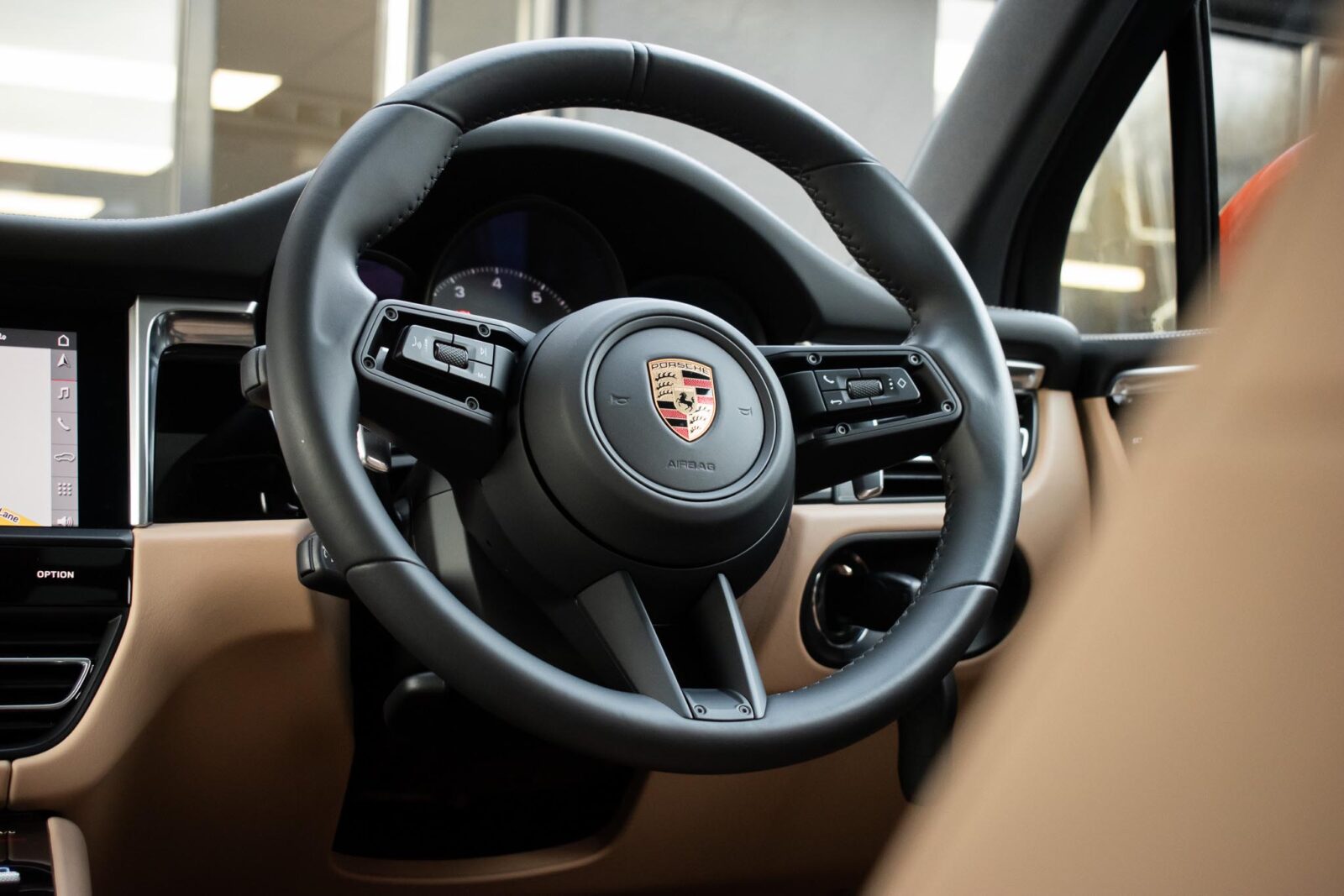 Papaya Metallic. Dual tone Black / Mojave Beige extended leather interior with contrast Mojave stitching, 14-way electric front comfort seats with lumbar support and memory function, heated multi-function GT sports steering wheel, adaptive cruise control, front heated seats, satellite navigation, Apple CarPlay, Bluetooth, Porsche connect apps, front and rear USB C’s, 20-inch Macan S alloy wheels with new set of N rated Pirelli tyres, panoramic glass sunroof, high gloss black roof rails, body coloured SportDesign exterior mirrors with high gloss black bases, body coloured door handles, roof spoiler and side window trims finished in high gloss black, power fold mirrors, powered boot lid, door sill guards brushed aluminium, side airbags in rear compartment, automatically dimming interior and exterior mirrors, privacy glass, lane departure warning, speed limit indicator, Porsche Active Suspension Management (PASM), sport mode button, power steering plus, front and rear sensors including surround view cameras, 75-litre fuel tank, tyre sealing compound and electric air compressor. Tracker. Balance of Porsche warranty. Full Official Porsche centre service history.