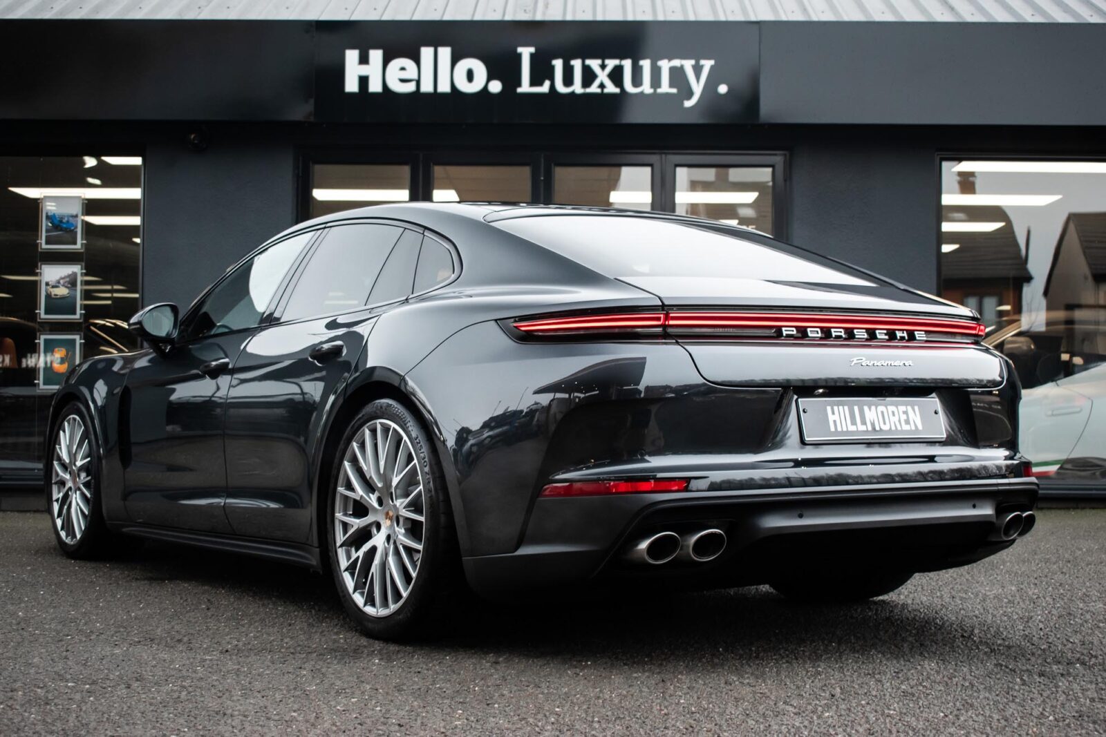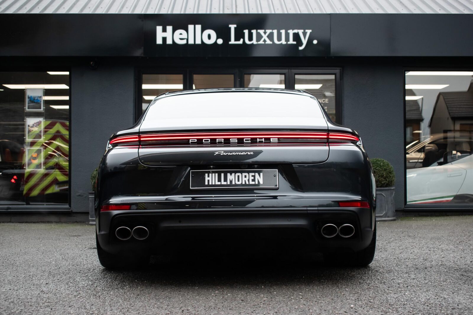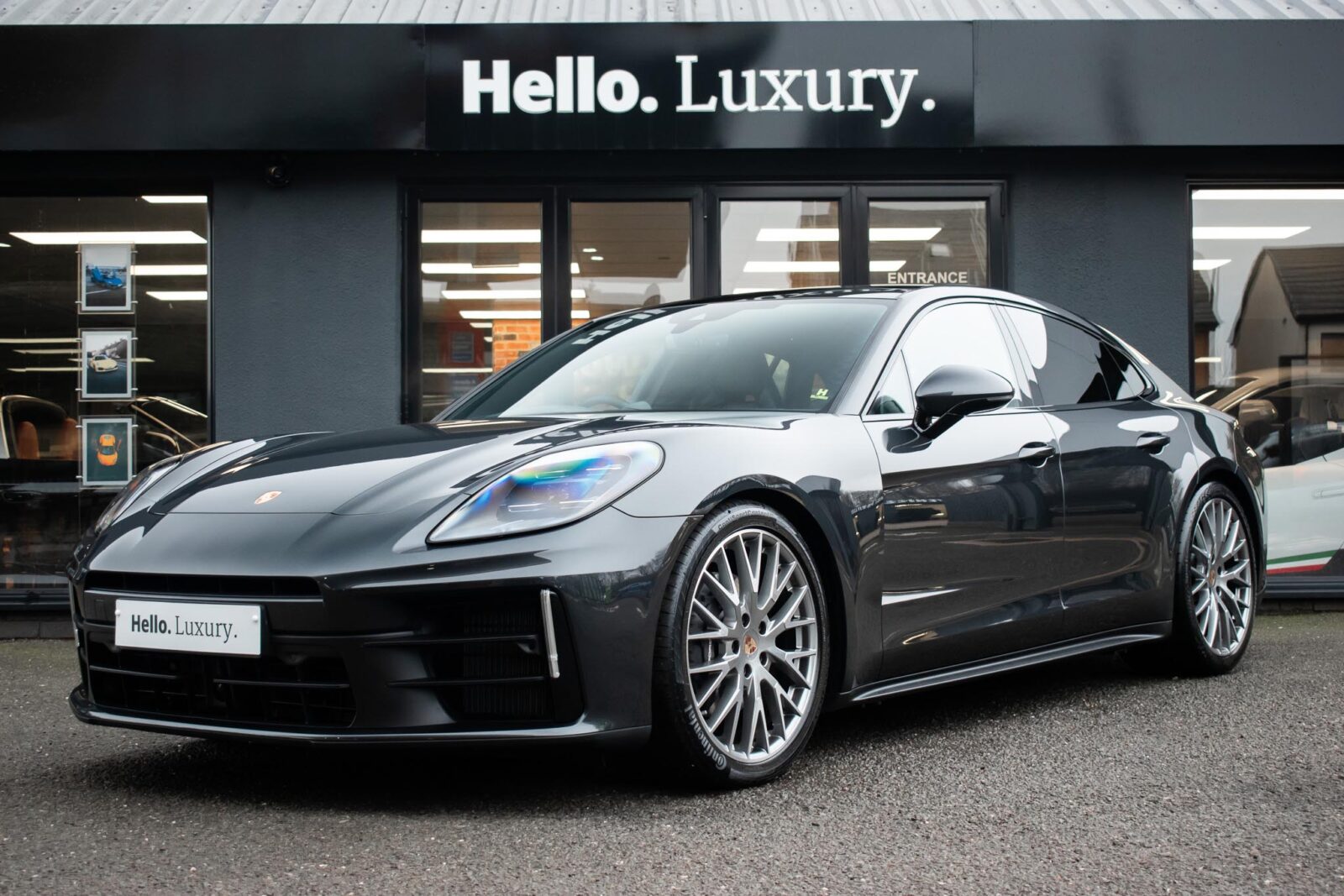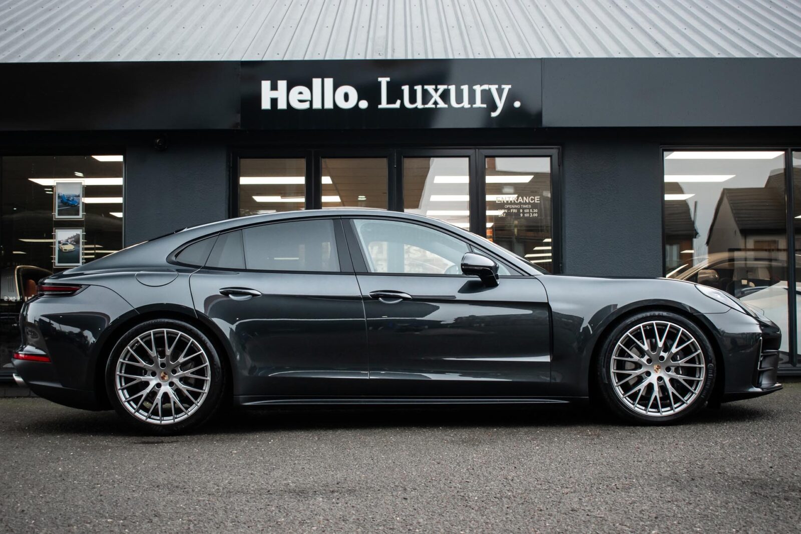 5 seat configuration. Volcano Grey metallic. Premium smooth finish black leather interior, extended leather to dashboard and door panels, full electric 14 way seats with lumbar support and memory function, multi-function steering wheel, 4 zone front and rear climate control, panoramic glass sunroof, BOSE surround sound, passenger display, comfort access, adaptive cruise control, lane change assist, power fold mirrors, 2+1 rear seating, heated steering wheel, configurable ambient lighting, sports chrono, sports tailpipes in silver, soft close doors, electric steering column adjustment, speed limit display, heated front seats, 21 inch Panamera Design alloy wheels, park sensors with reverse camera. Balance of Porsche warranty.