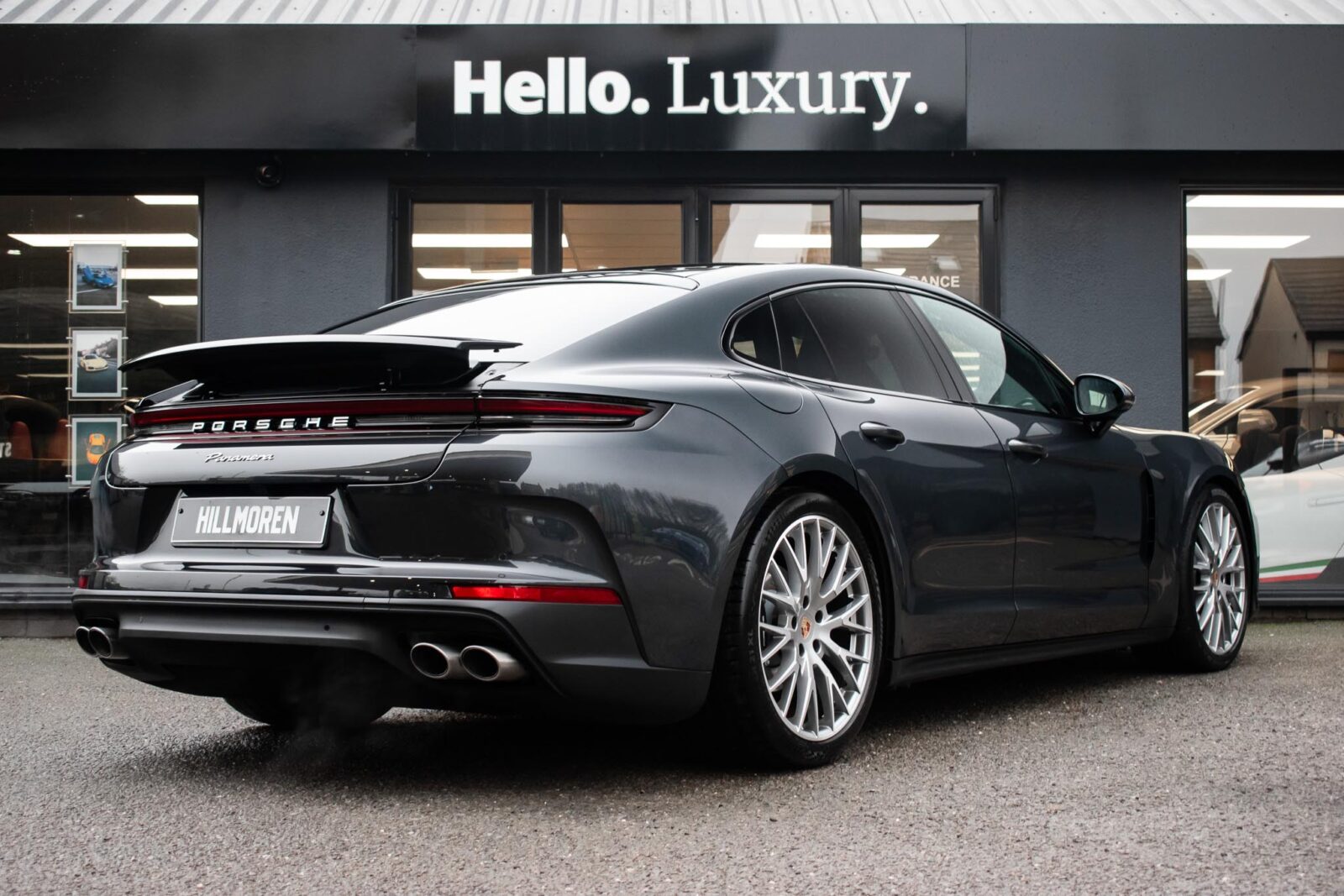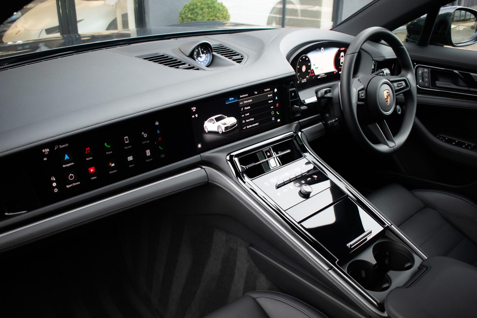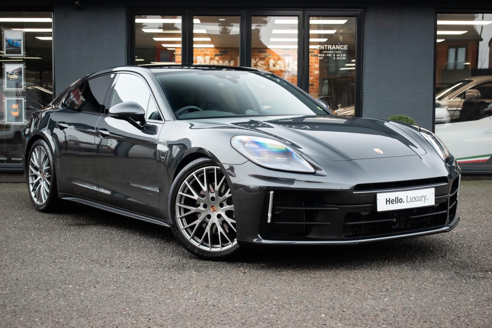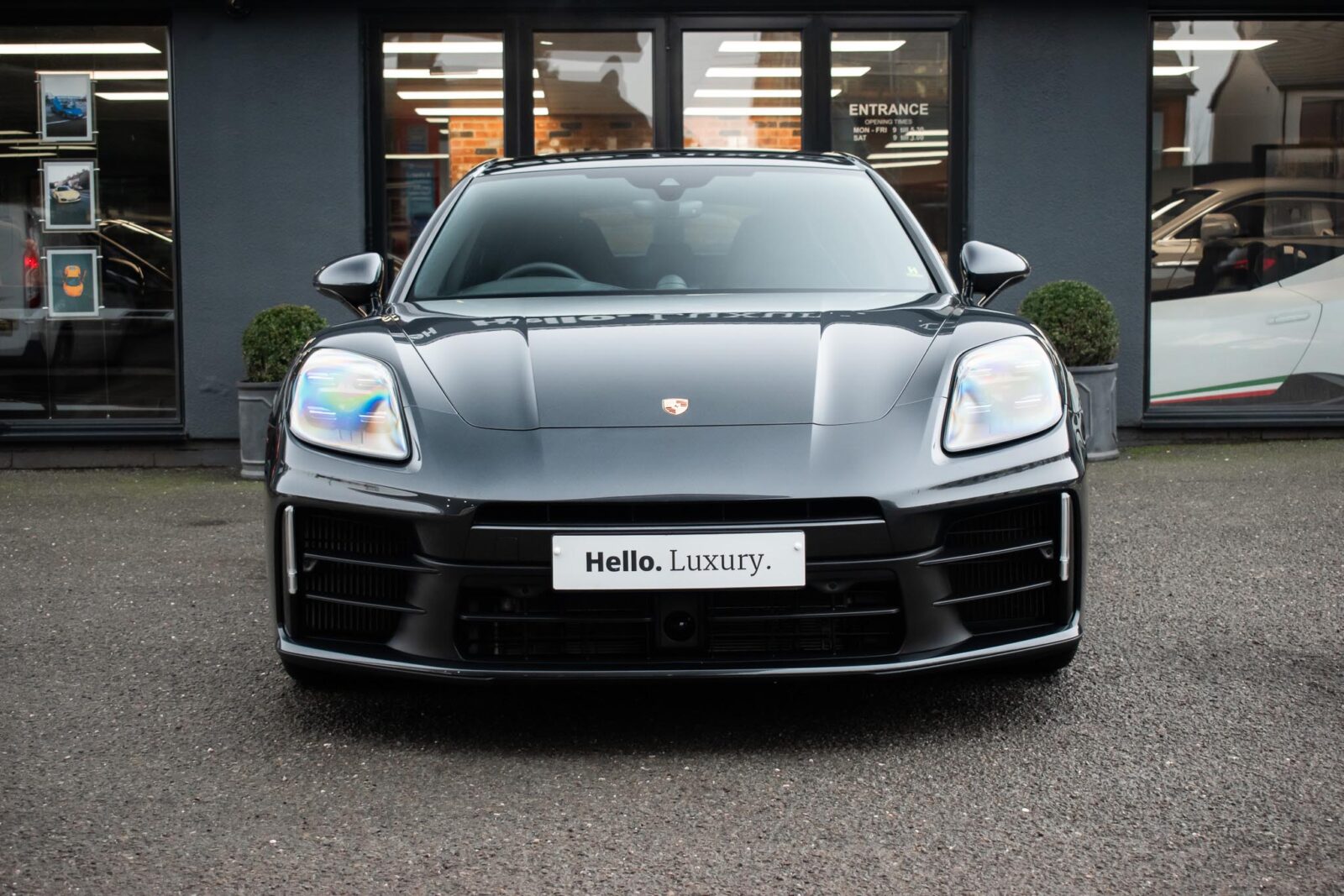 5 seat configuration. Volcano Grey metallic. Premium smooth finish black leather interior, extended leather to dashboard and door panels, full electric 14 way seats with lumbar support and memory function, multi-function steering wheel, 4 zone front and rear climate control, panoramic glass sunroof, BOSE surround sound, passenger display, comfort access, adaptive cruise control, lane change assist, power fold mirrors, 2+1 rear seating, heated steering wheel, configurable ambient lighting, sports chrono, sports tailpipes in silver, soft close doors, electric steering column adjustment, speed limit display, heated front seats, 21 inch Panamera Design alloy wheels, park sensors with reverse camera. Balance of Porsche warranty.