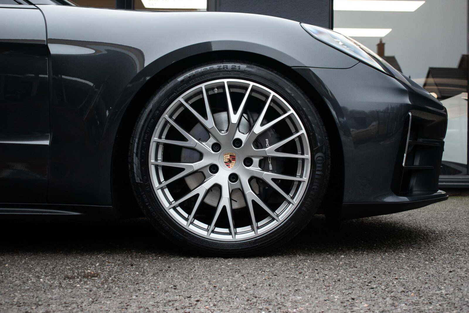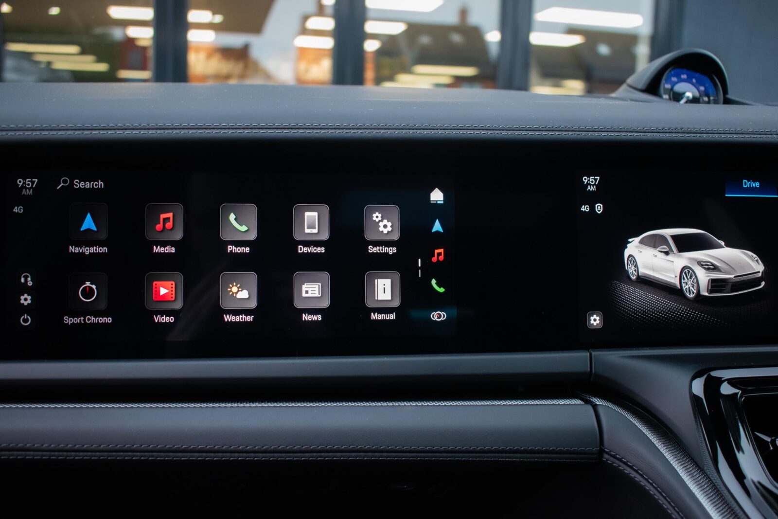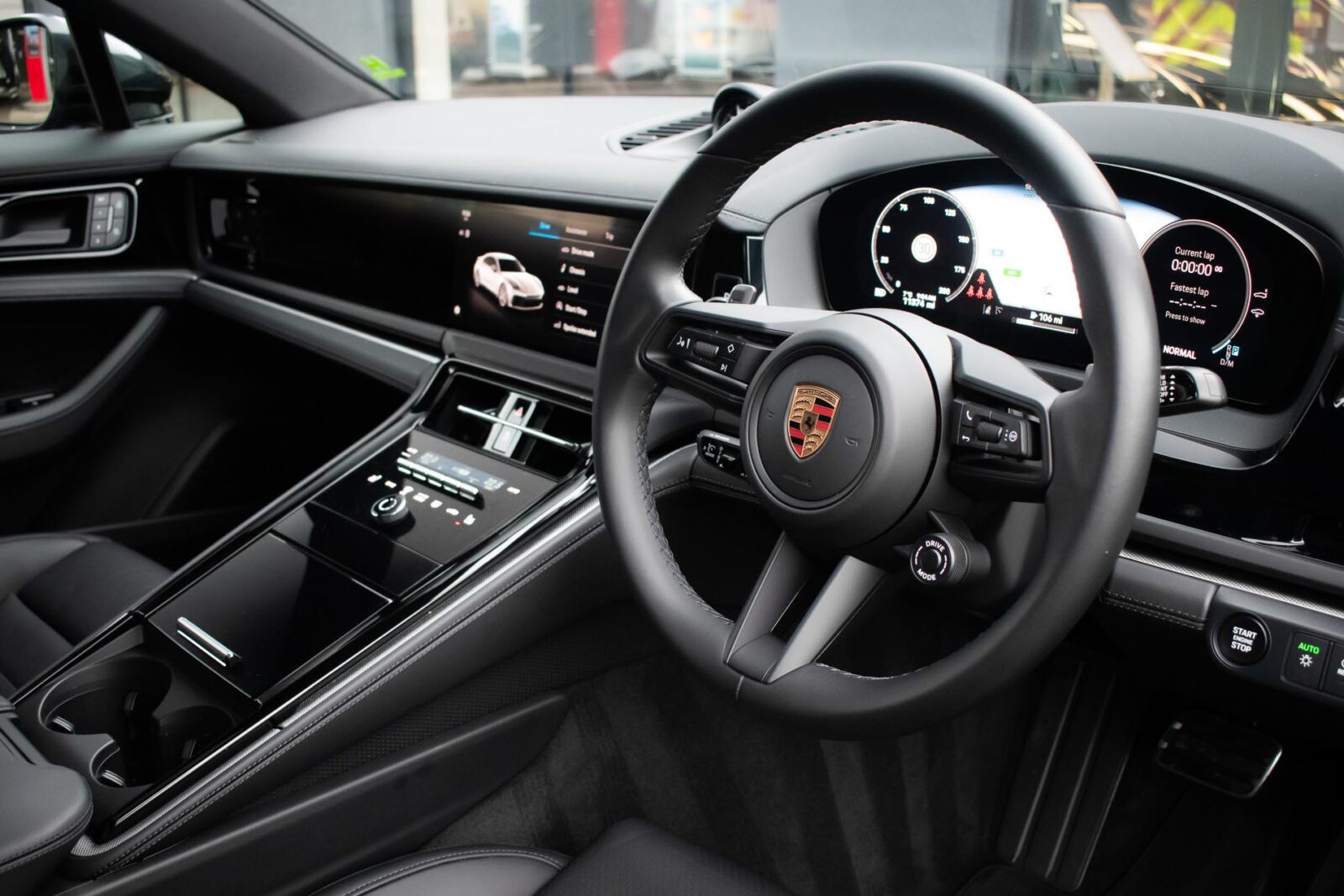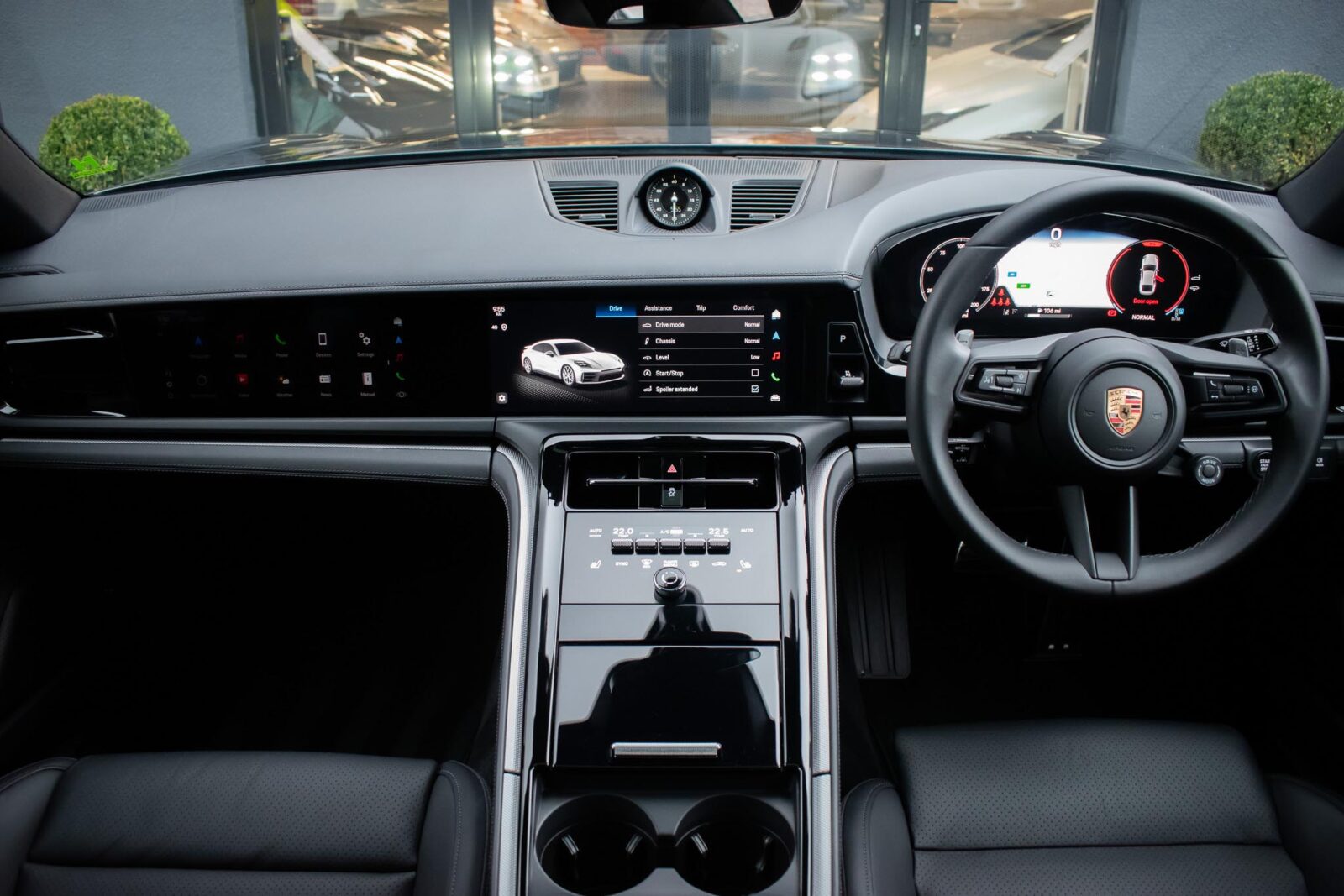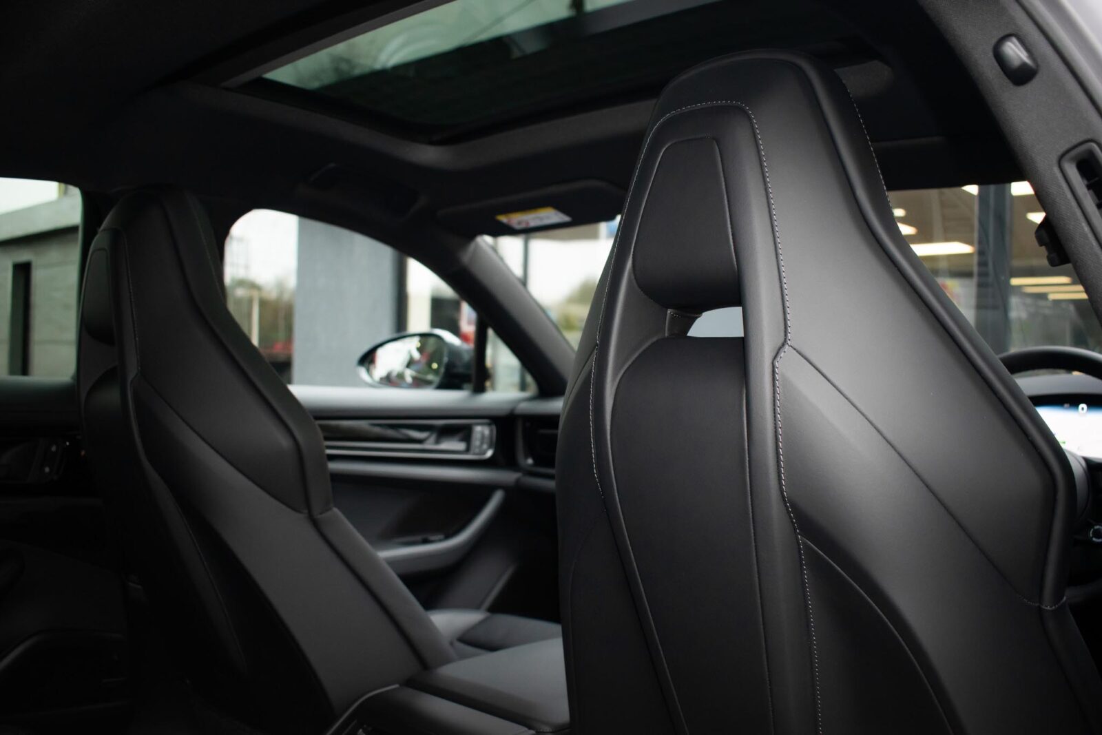 5 seat configuration. Volcano Grey metallic. Premium smooth finish black leather interior, extended leather to dashboard and door panels, full electric 14 way seats with lumbar support and memory function, multi-function steering wheel, 4 zone front and rear climate control, panoramic glass sunroof, BOSE surround sound, passenger display, comfort access, adaptive cruise control, lane change assist, power fold mirrors, 2+1 rear seating, heated steering wheel, configurable ambient lighting, sports chrono, sports tailpipes in silver, soft close doors, electric steering column adjustment, speed limit display, heated front seats, 21 inch Panamera Design alloy wheels, park sensors with reverse camera. Balance of Porsche warranty.