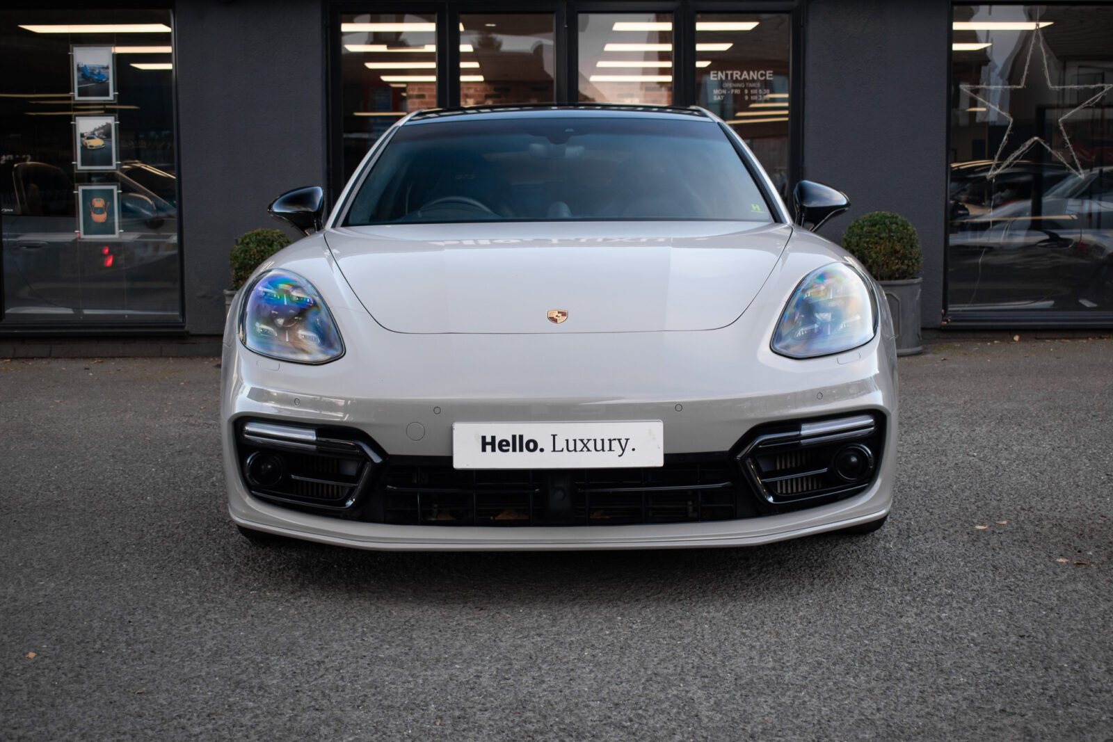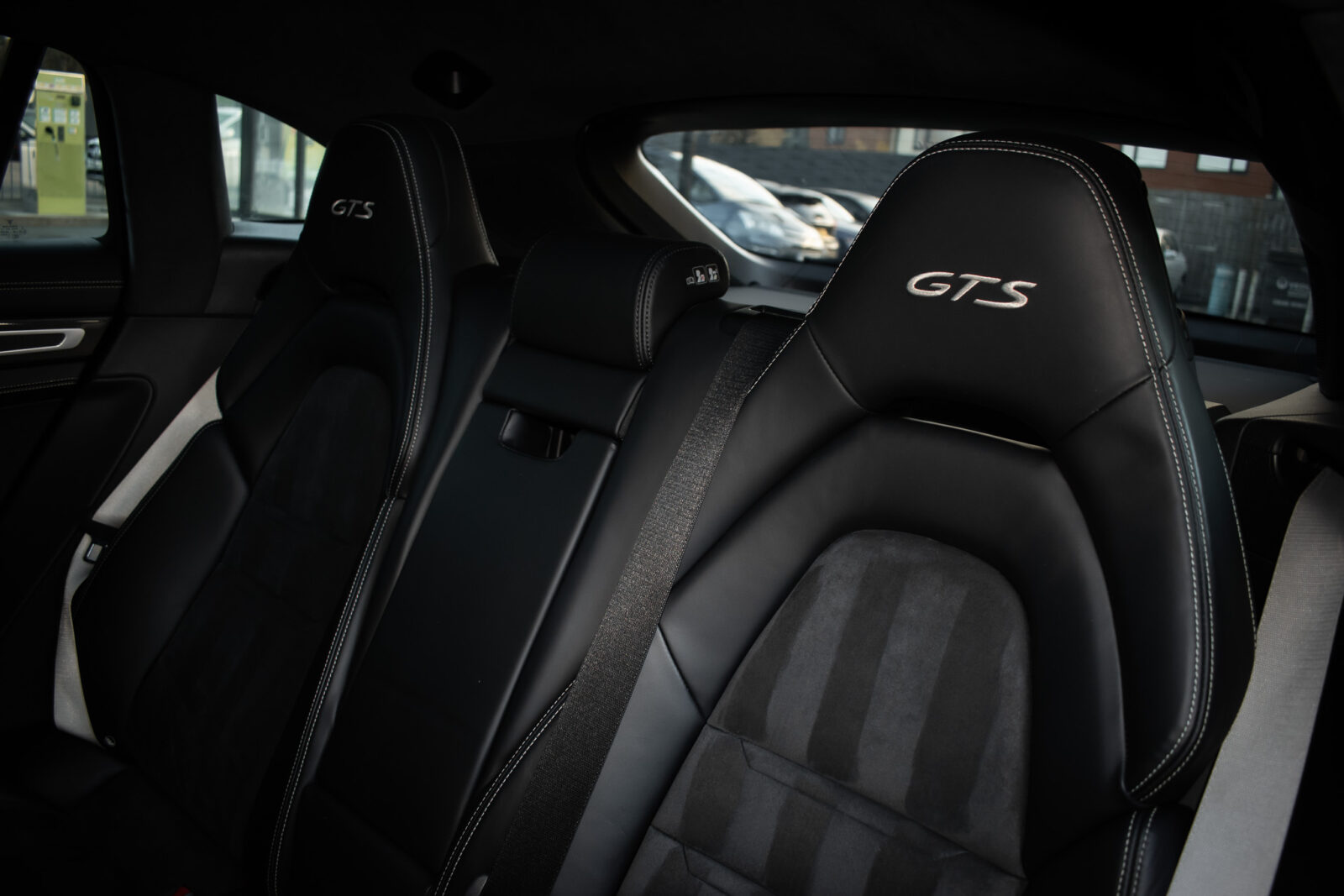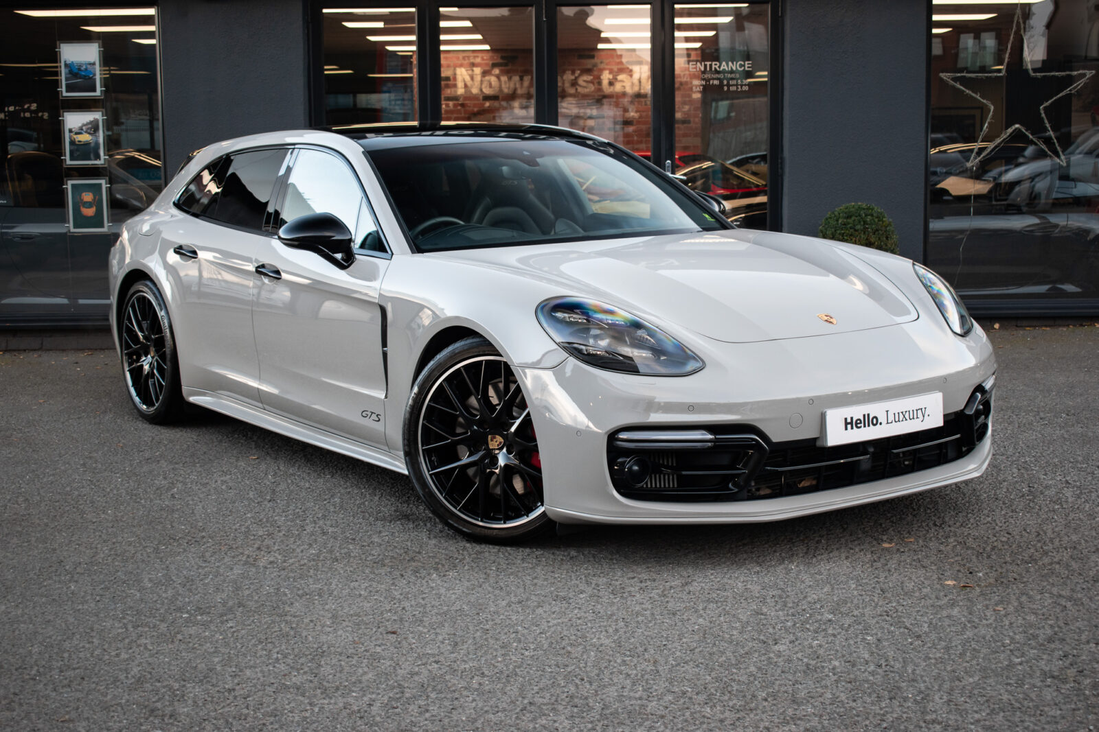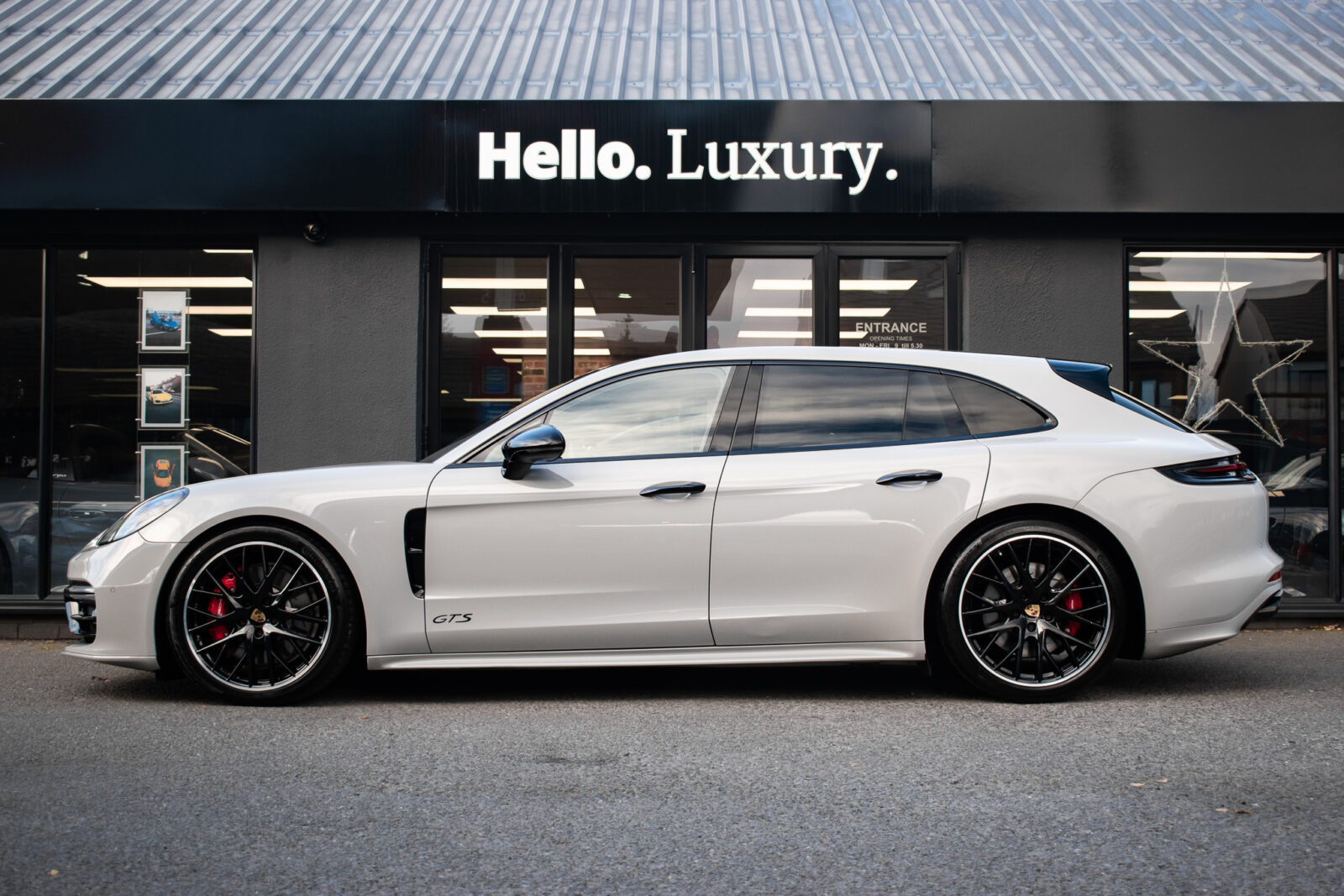 Crayon Grey. 4+1 seating configuration. Black leather / Alcantara GTS interior package with Crayon contrast stitching, Crayon seatbelts, electric 18 way adaptive sports seats with lumbar support and memory function, heated multi-function sport steering wheel finished in leather, four-zone automatic climate control, adaptive cruise control, head up display, night vision assist, satellite navigation, BOSE surround sound, Apple CarPlay, DAB radio, Bluetooth, carbon interior package, front and rear heated seats, front cup holder covers, panoramic glass sunroof, 21″ Panamera SportDesign alloy wheels finished in high-gloss black, switchable sports exhaust, SportDesign package finished in high-gloss black, door handles and mirrors finished in high-gloss black, LED main headlights in black with matrix beam and PDLS plus, Sports Chrono with mode switch, crayon rev counter dial and sport chrono dial, switchable sports exhaust system, Porsche Dynamic Chassis Control Sport (PDCC) including Porsche Torque Vectoring Plus (PTV Plus), rear axle steering including Power Steering Plus, lane change assist, Red brake calipers, illuminated carbon door sill guards, preparation for Porsche rear seat entertainment, keyless ignition, storage package, parking sensors with reverse camera, privacy glass, preparation for towbar system. Full Official Porsche centre service history.