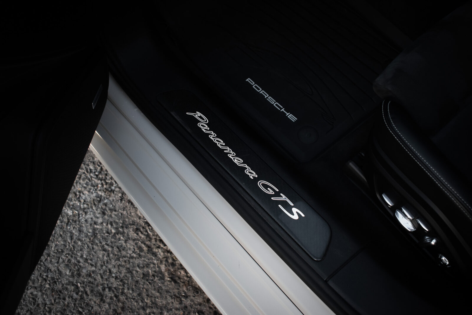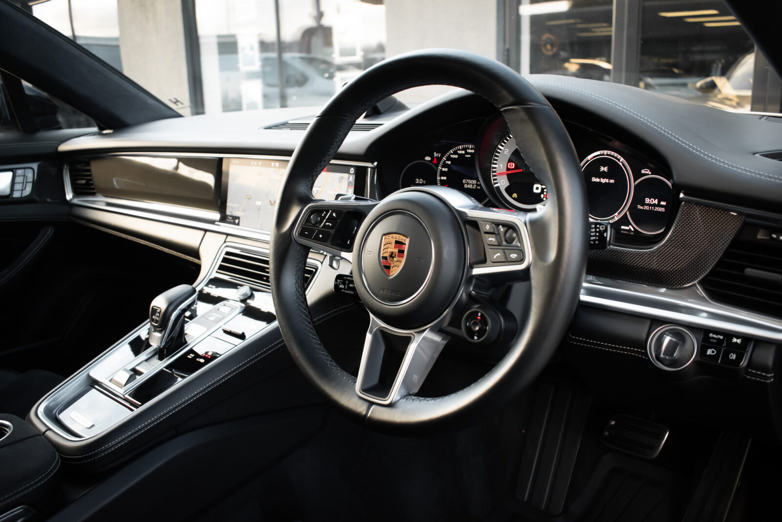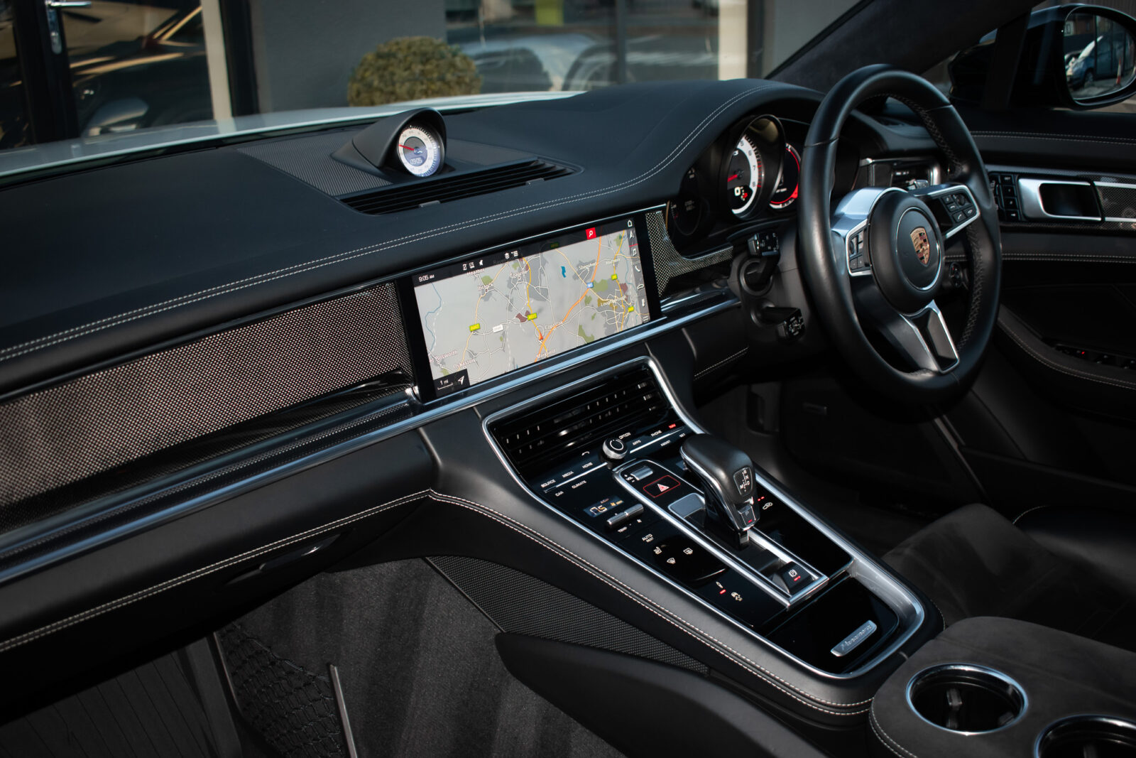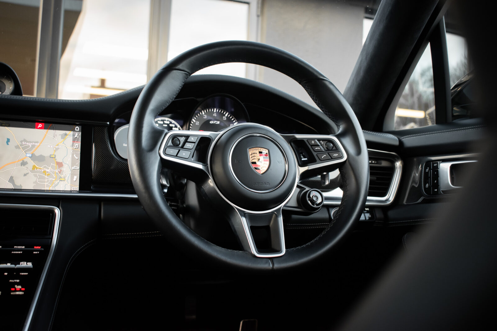 Crayon Grey. 4+1 seating configuration. Black leather / Alcantara GTS interior package with Crayon contrast stitching, Crayon seatbelts, electric 18 way adaptive sports seats with lumbar support and memory function, heated multi-function sport steering wheel finished in leather, four-zone automatic climate control, adaptive cruise control, head up display, night vision assist, satellite navigation, BOSE surround sound, Apple CarPlay, DAB radio, Bluetooth, carbon interior package, front and rear heated seats, front cup holder covers, panoramic glass sunroof, 21″ Panamera SportDesign alloy wheels finished in high-gloss black, switchable sports exhaust, SportDesign package finished in high-gloss black, door handles and mirrors finished in high-gloss black, LED main headlights in black with matrix beam and PDLS plus, Sports Chrono with mode switch, crayon rev counter dial and sport chrono dial, switchable sports exhaust system, Porsche Dynamic Chassis Control Sport (PDCC) including Porsche Torque Vectoring Plus (PTV Plus), rear axle steering including Power Steering Plus, lane change assist, Red brake calipers, illuminated carbon door sill guards, preparation for Porsche rear seat entertainment, keyless ignition, storage package, parking sensors with reverse camera, privacy glass, preparation for towbar system. Full Official Porsche centre service history.